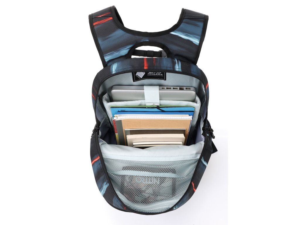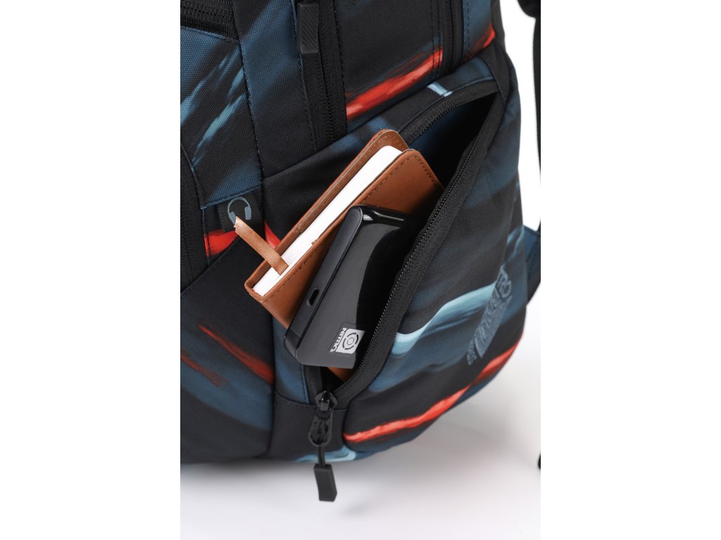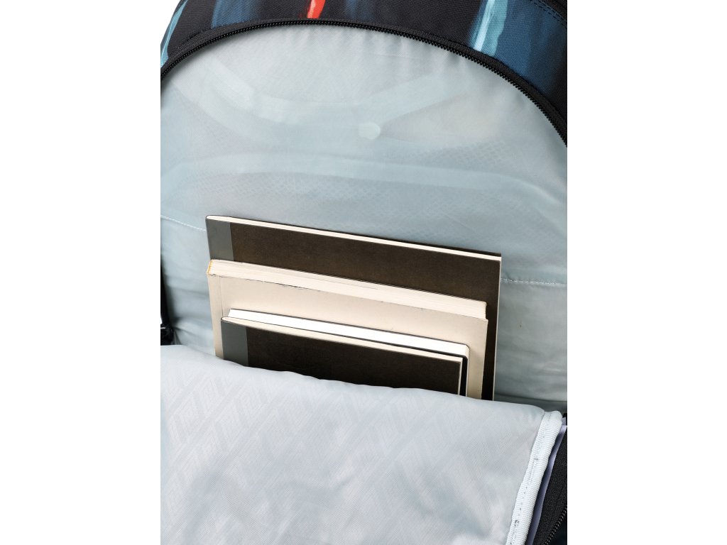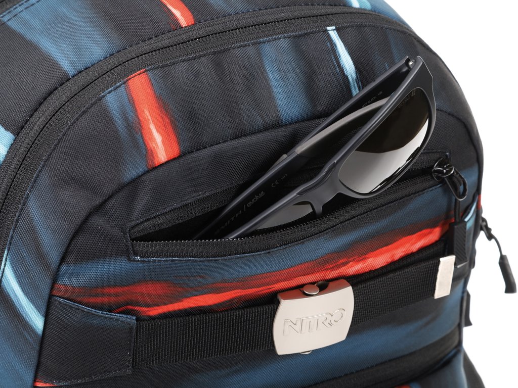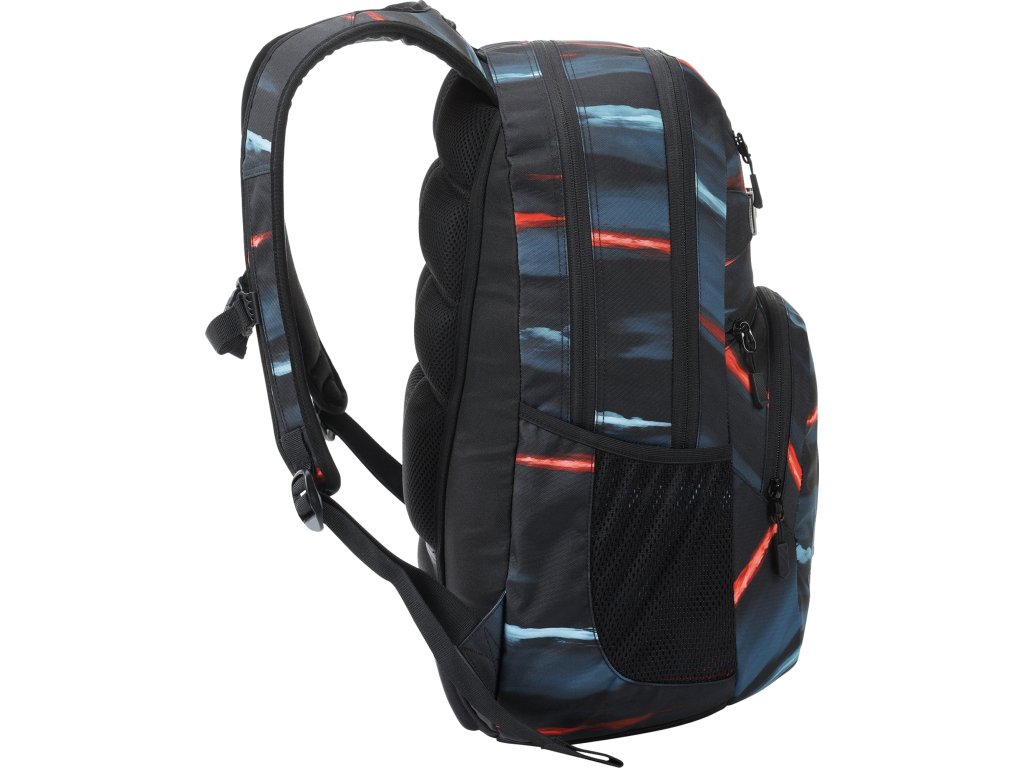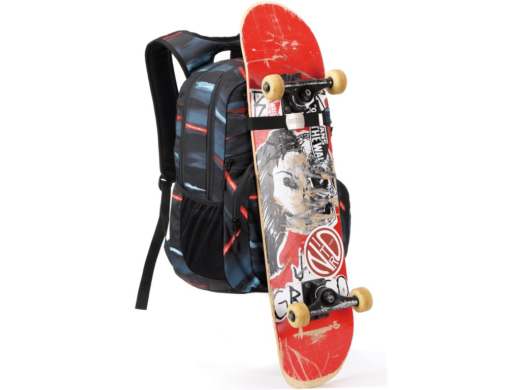 Objem 37 l. Fleecem vystlaná kapsa na brýle a podobně choulostivé věci, dvě hlavní prostorná oddělení, kapsa na tablet, vypolstrovaná kapsa na 17" notebook, popruh na nesení skateboardu, postranní kapsa na zip, postranní síťovinová kapsa na lahev.. Rozměry přibližně 52 x 38 x 23 cm. Materiál 600D polyester, hmotnost 980 g.