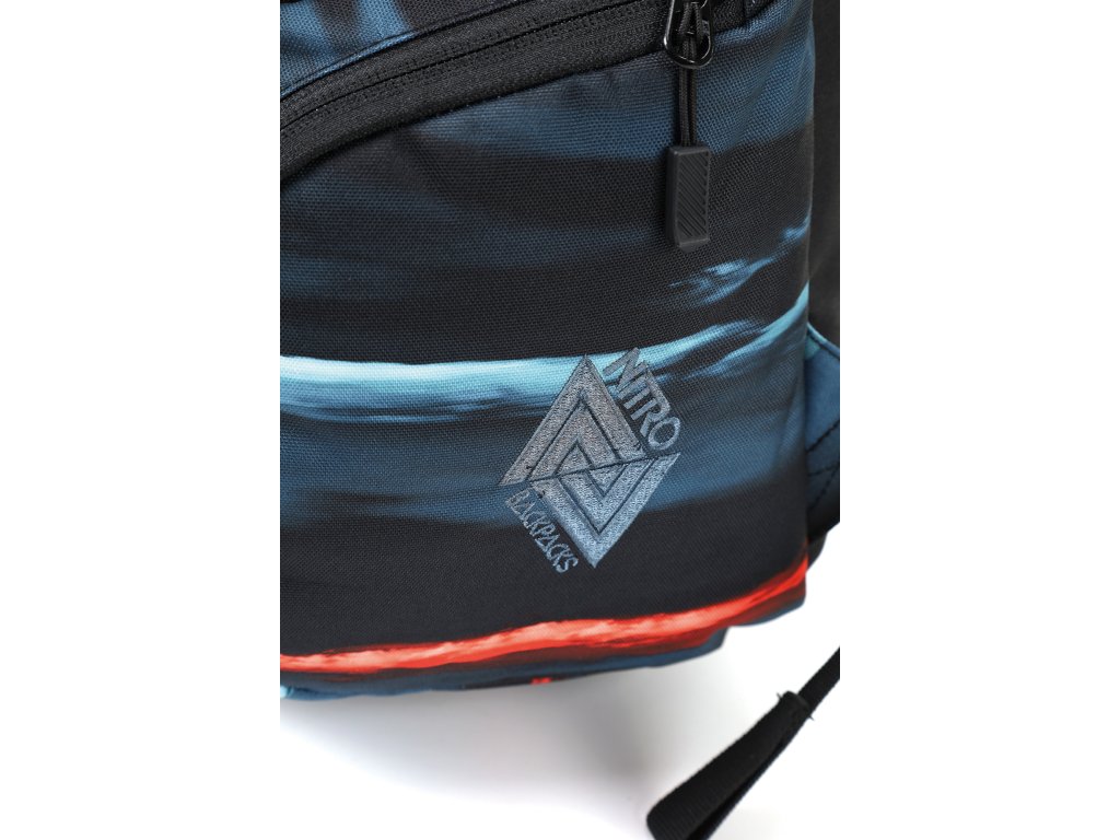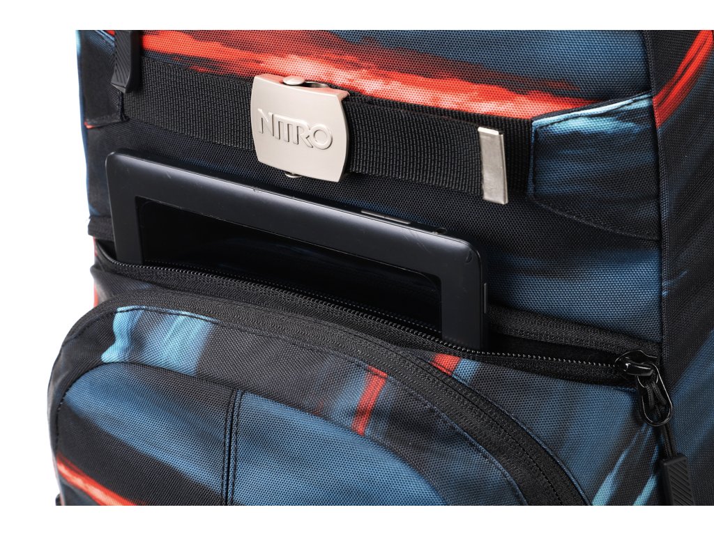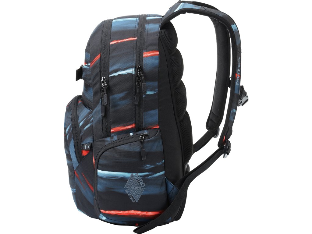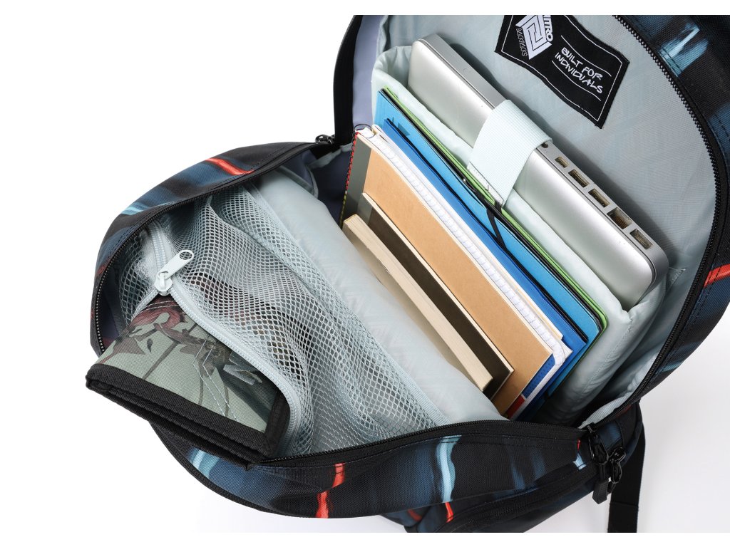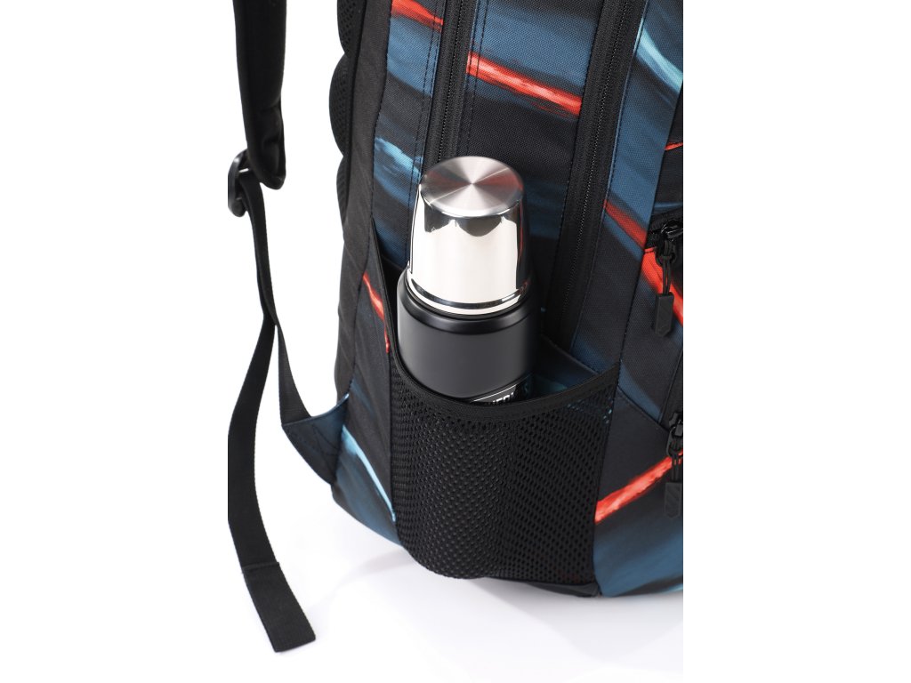 Objem 37 l. Fleecem vystlaná kapsa na brýle a podobně choulostivé věci, dvě hlavní prostorná oddělení, kapsa na tablet, vypolstrovaná kapsa na 17" notebook, popruh na nesení skateboardu, postranní kapsa na zip, postranní síťovinová kapsa na lahev.. Rozměry přibližně 52 x 38 x 23 cm. Materiál 600D polyester, hmotnost 980 g.