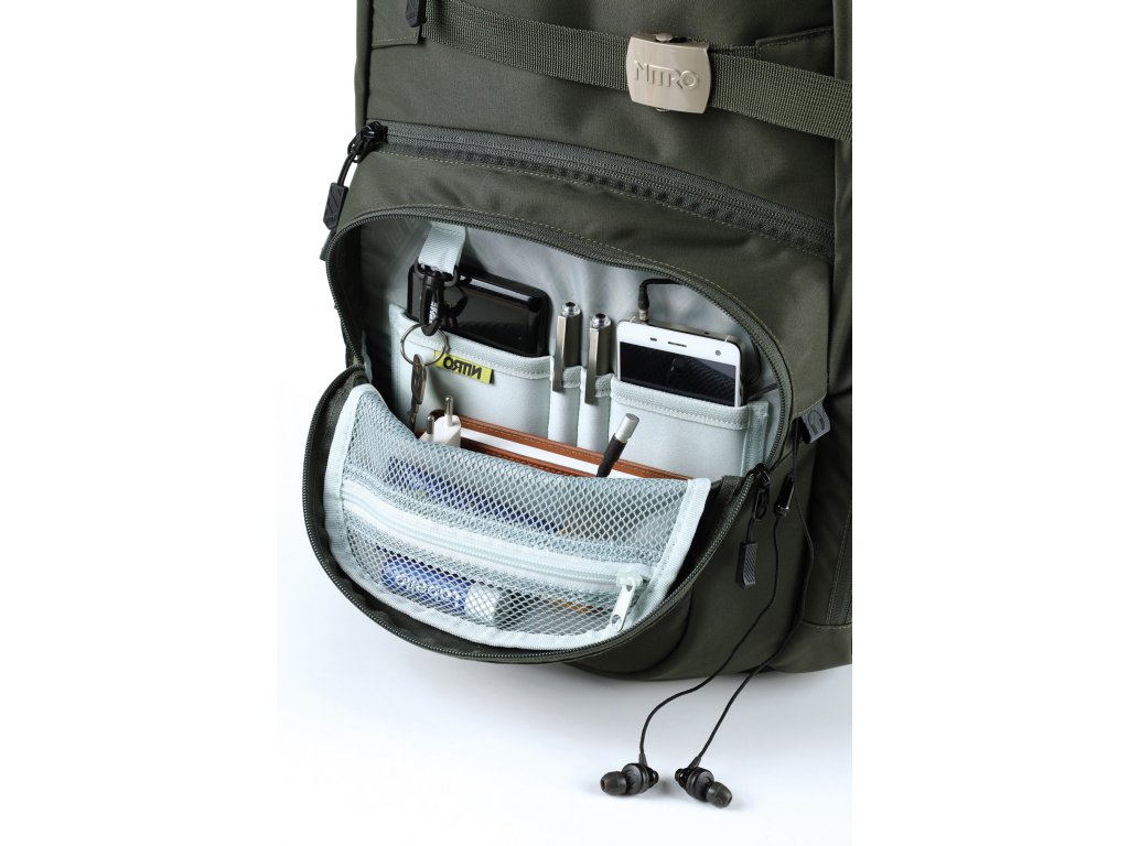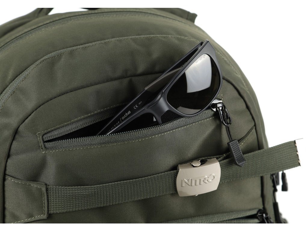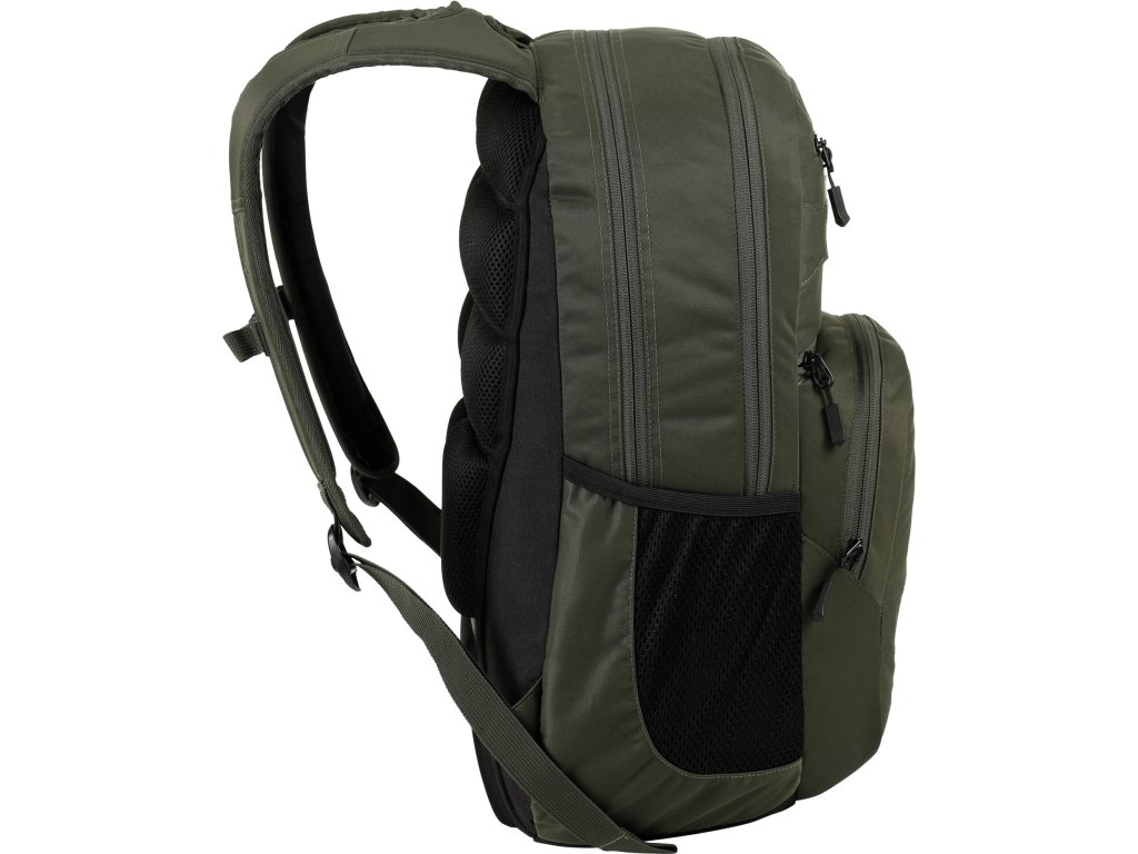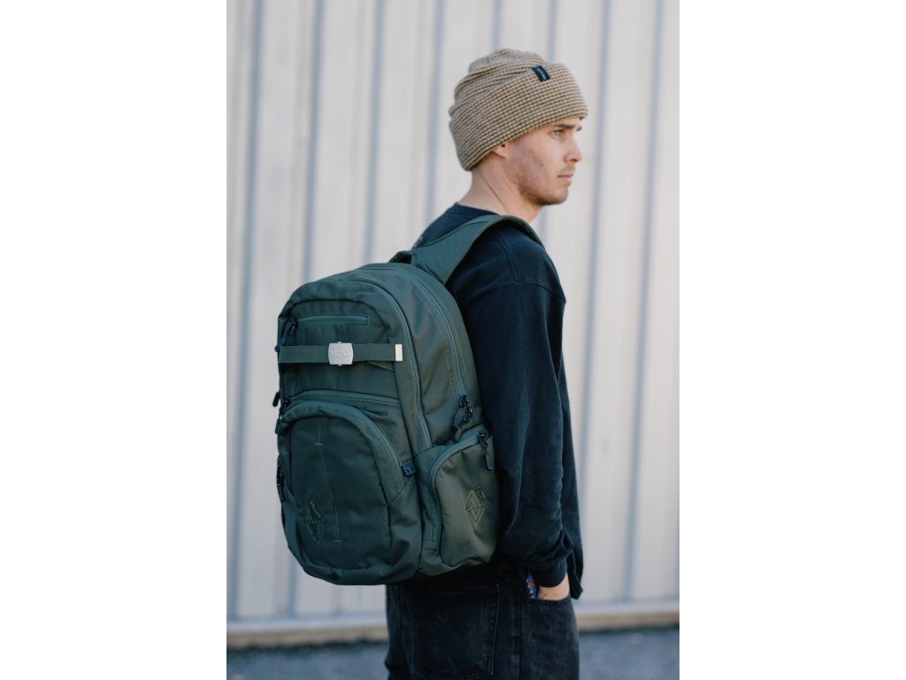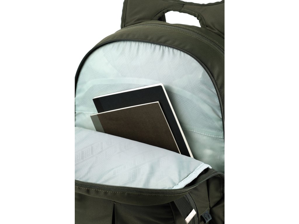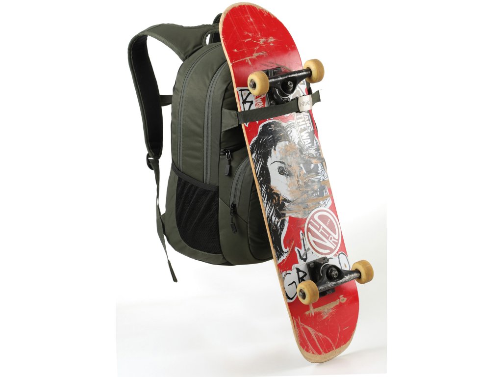 Fleecem vystlaná kapsa na brýle a podobně choulostivé věci, dvě hlavní prostorná oddělení, kapsa na tablet, vypolstrovaná kapsa na 17" notebook, popruh na nesení skateboardu, postranní kapsa na zip, postranní síťovinová kapsa na lahev. Objem 37 l. Rozměry přibližně 52 x 38 x 23 cm. Hmotnost 980 g.