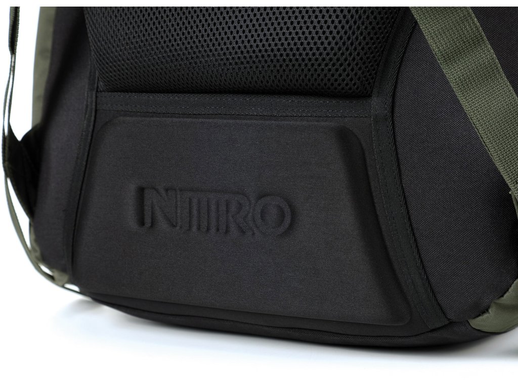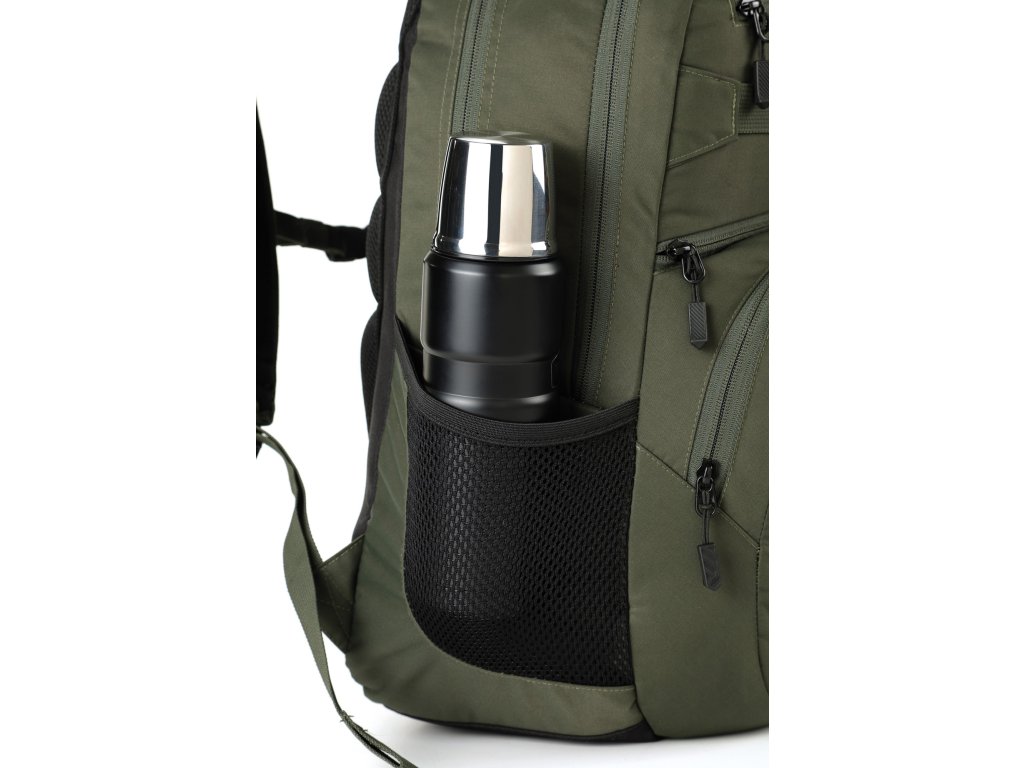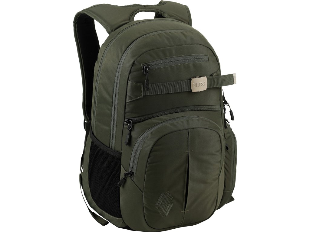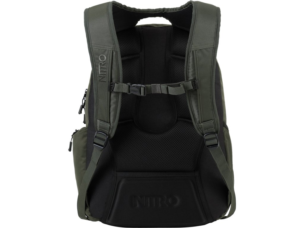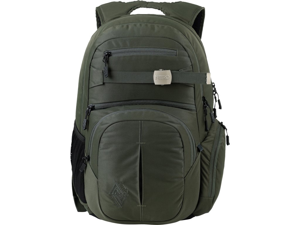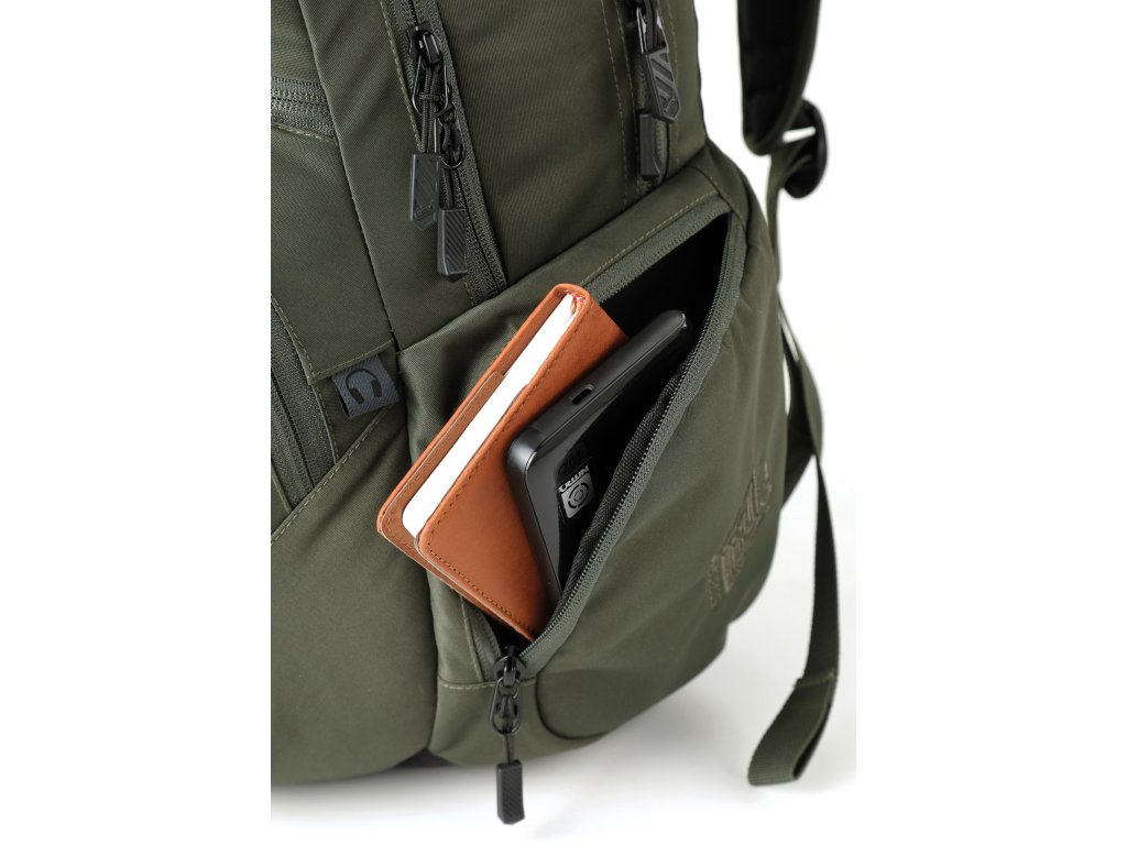 Fleecem vystlaná kapsa na brýle a podobně choulostivé věci, dvě hlavní prostorná oddělení, kapsa na tablet, vypolstrovaná kapsa na 17" notebook, popruh na nesení skateboardu, postranní kapsa na zip, postranní síťovinová kapsa na lahev. Objem 37 l. Rozměry přibližně 52 x 38 x 23 cm. Hmotnost 980 g.