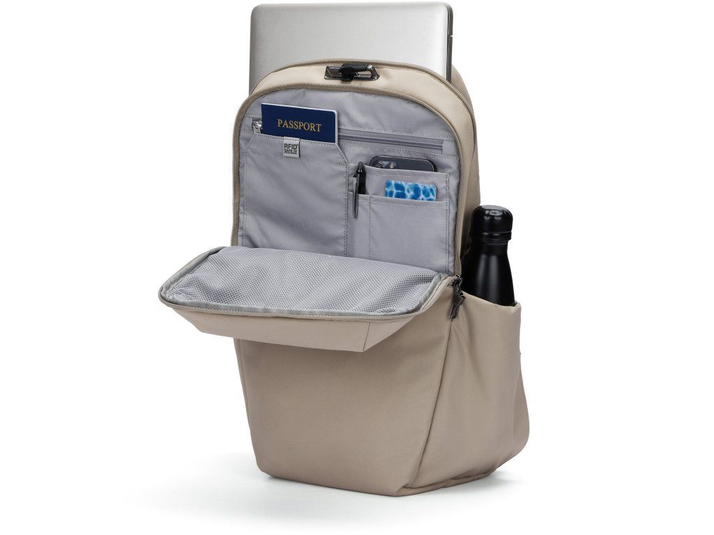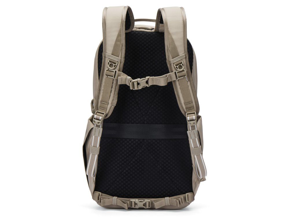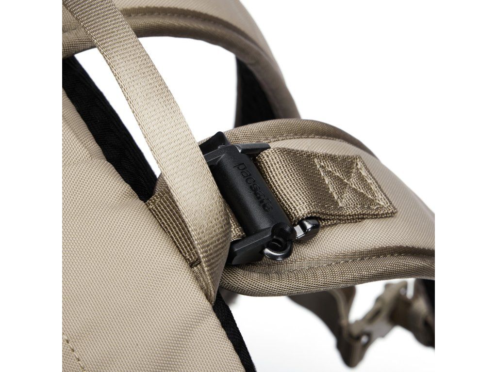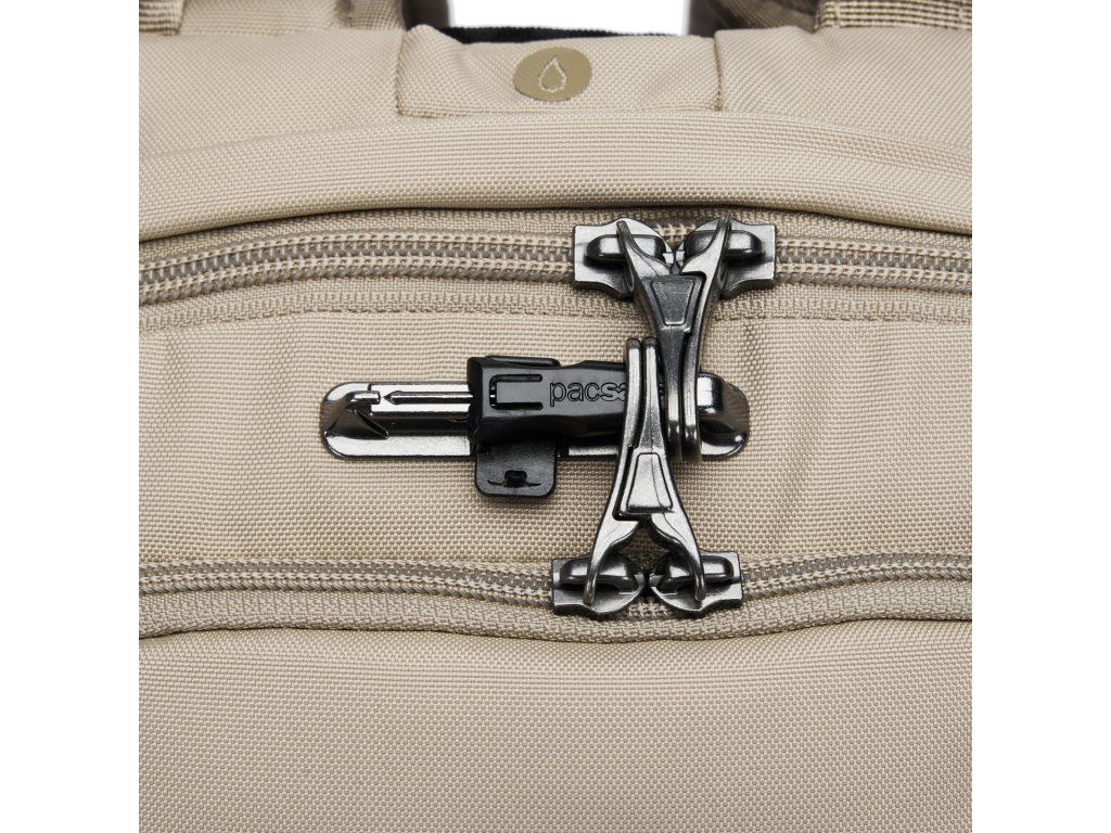 Zabezpečený batoh. Batohy a zavazadla Pacsafe jsou navrženy a vyrobeny tak, aby zabránily krádeži vašeho zavazadla, jeho obsahu i vaší identity a peněz z platebních karet. Batoh před krádeží chrání PopNLock bezpečnostní přezka, díky které ho lze rychle připoutat ke stolu, topení nebo zábradlí. Tolik "oblíbenému" přeřezání popruhů zabraňují 2 zapletená ocelová lanka v systému Carrysafe®. Přední panel je chráněn sítí ocelových lanek eXomesh®. Vnitřek batohu dále chrání zipy zajištěné pomocí unikátního systému Roobar® Sport. Vaše čipové karty a doklady jsou před možným zneužítím bezpečně uloženy v RFIDsafe® kapse.