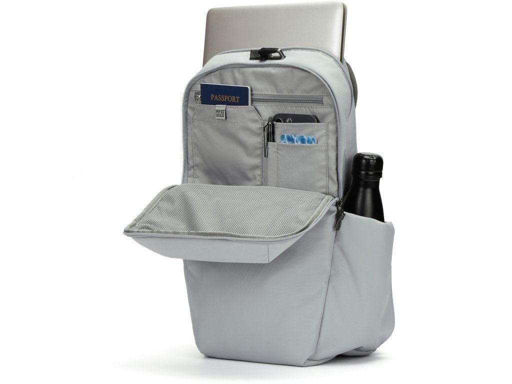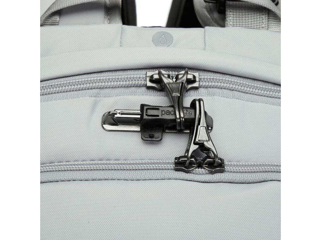 Zabezpečený batoh. Batohy a zavazadla Pacsafe jsou navrženy a vyrobeny tak, aby zabránily krádeži vašeho zavazadla, jeho obsahu i vaší identity a peněz z platebních karet. Batoh před krádeží chrání PopNLock bezpečnostní přezka, díky které ho lze rychle připoutat ke stolu, topení nebo zábradlí. Tolik "oblíbenému" přeřezání popruhů zabraňují 2 zapletená ocelová lanka v systému Carrysafe®. Přední panel je chráněn sítí ocelových lanek eXomesh®. Vnitřek batohu dále chrání zipy zajištěné pomocí unikátního systému Roobar® Sport. Vaše čipové karty a doklady jsou před možným zneužítím bezpečně uloženy v RFIDsafe® kapse.