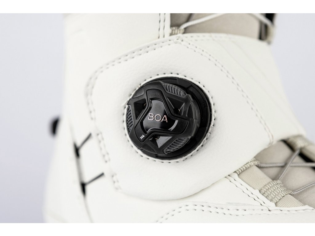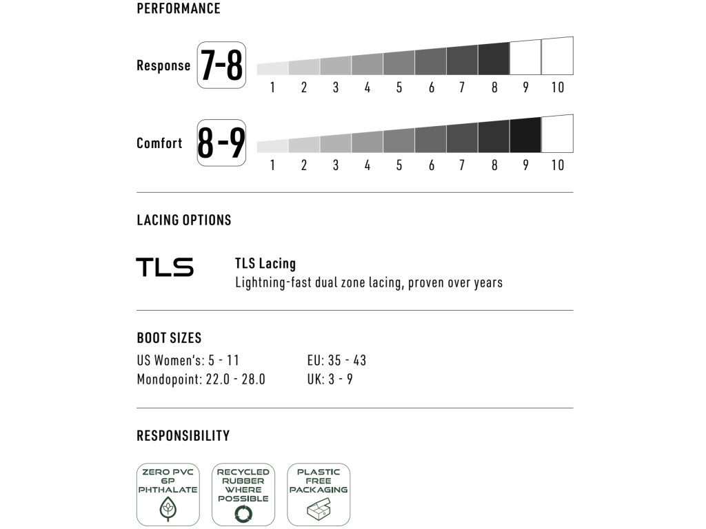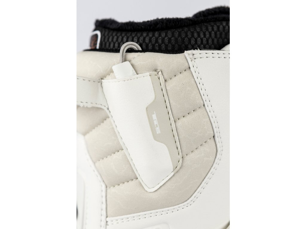 Při pohledu na Cave TLS Step On® ti bude hned jasné, že máš před sebou něco speciáního. Evoluční potomek revoluční kolaborace Nitro týmu s těmi nejlepšími z nejlepších vyvinulo novou botu Cave TLS, která je plně kompatibilní s vázáním Step On®. Spojení vysoké kvality a komfortu, který je u Nitra již po dekády standardem, s průlomovým bezpřeskovým rychlo systémem nástupu do vázání Step On® budeš jen těžko hledat konkurenci. Precizní zpracování konstrukce zaručí, že ti bota sedne na nohu jako ulitá a ty už nebudeš chtít jezdit v ničem jiném. Dámská Step On® podrážka z odolné gumy s výbornou přilnavostí a oděruodolností v kombinaci s nárazy tlumící EVA mezipodešví tě udrží celý den ve formě, zatímco přemodelovaná, tvarovatelná vnitřní vložka Cloud 9 zase v teple. Anatomicky formovaná 3D výztuha hřbetu boty, integrovaná podpora kotníku a vyjímatelný ztvrďovák jazyka rozprostře rovnoměrně utahovací sílu, abys mohla s jistotou řezat jeden oblouk za druhým. Nechybí spolehlivé TLS Twin šněrování se kterým se nazuješ a vyzuješ za míň jak 60 sekund a ILS šněrování vnitřní botky s Re/Lace utahováním pro jednoduché dotažení za pochodu. Životnost tkaniček prodlouží 45° Laceglider s novým Solo Laceglider. Pro prvotřídní oporu v jízdě a pevné ukotvení nohy v botě jsme Cave letos vybavili přezkou přes nárt s Boa utahováním. Přemodelovaná vnitřní botka Cloud 9 má perfektní termoizolační vlastnosti, 3D tvarovaný jazyk i oblast paty. Její přední panel Flex Toe zajišťuje dostatek prostoru pro prsty a vylepšená Ortholite® stélka o dvojí hustotě materiálu se zvýšenou oporou paty dodá tvé jízdě na jistotě a pohodě, navíc je antibakteriální a dá se prát. Jestli se nebojíš progrese, vyzkoušej tenhle opus dvou snowboardových inovátorů. * DÁMSKÁ STEP ON® PODRÁŽKA Z ODOLNÉ PŘÍRODNÍ GUMY * DÁMSKÁ STEP ON® EVA MEZIPODEŠEV * TERMOIZOLAČNÍ VRSTVA THERMINATOR SHIELD * FLEX LINK DESIGN * ZPEVNĚNÍ HŘBETU BOTY ARMORED SPINE * SOLO LACEGLIDER * 45° LACEGLIDER * UTAHOVACÍ SYSTÉM TLS TWIN LACING SYSTÉM, TVAROVANÁ TLS TÁHLA * BAIL OUT SYSTÉM * PŘEZKA PŘES NÁRT S BOA® KOLEČKEM * VYLEPŠENÁ INTEGROVANÁ PODPORA KOTNÍKU * NASTAVITELNÁ TVRDOST JAZYKA * INOVOVANÁ, VNITŘNÍ TEPELNĚ TVAROVATELNÁ BOTIČKA (VLOŽKA) CLOUD 9 *ILS UTAHOVÁNÍ VNITŘNÍ BOTIČKY, RE/LACE ZÁMEK UTAHOVÁNÍ BOTIČKY * ORTHOLITE® HIGH CUP STÉLKA Z MATERIÁLU DVOU HUSTOT * TUHOST: 7-8.