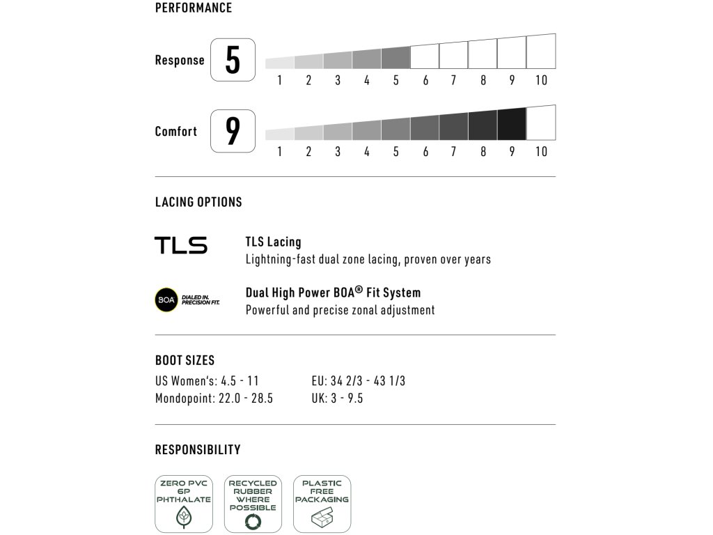 Dámské snowboardové boty, které holky milují. Crown jsou jsou letos ještě pevnější a pohodlnější, aby si na své přišly i zkušené snowboardistky. Bota, která tě poslechne a zároveň ti přináší pohodlí, sucho a teplo. Podrážka kombinuje EVA (lehký, tlumící a skvěle tepelně izolující materiál) a odolnou a přilnavou přírodní gumu, která je strategicky umístěná na zvláště namáhaných místech, aby bota vydržela pořádný jezdecký zápřah a sloužila ti spolehlivě roky. Pohodlí je klíč k úspěchu, proto je tu vnitřní tepelně tvarovatelná vložka Cloud 6 s perfektními termoizolačními vlastnostmi. Je lehká, má 3D tvarovaný jazyk i patu, pružně podpůrnou kostru a nabízí zvýšený komfort pro tvé prstíky, který zajistí přední panel Flex Toe. Vložku ještě doplňuje anatomicky tvarovaná stélka ORTHOLITE® High Cup. Re/Lace je náš pomocník pro pohodlnější šněrování vnitřní vložky. Spolehlivé utažení boty po celý den zajišťuje jednoduše účinný dvouzónový High Power BOA® systém, kterému úspěšně sekunduje BAIL OUT systém pro bleskové rozšněrování a vystoupení z bot. * EVA PODRÁŽKA DOPLNĚNÁ ODOLNÝMI IMPACT PANELS Z GUMY * FLEX LINK DESIGN * 45° LACEGLIDER * UTAHOVÁNÍ HIGH POWER BOA® DUAL ZONE * BAIL OUT SYSTÉM * WOMEN'S VNITŘNÍ BOTIČKA TEPELNĚ TVAROVATELNÁ (VLOŽKA) CLOUD 6 LINER * ILS UTAHOVÁNÍ VNITŘNÍ BOTIČKY, RE/LACE ZÁMEK UTAHOVÁNÍ BOTIČKY * DÁMSKÁ STÉLKA ORTHOLITE® HIGH CUP * TVRDOST: 5.