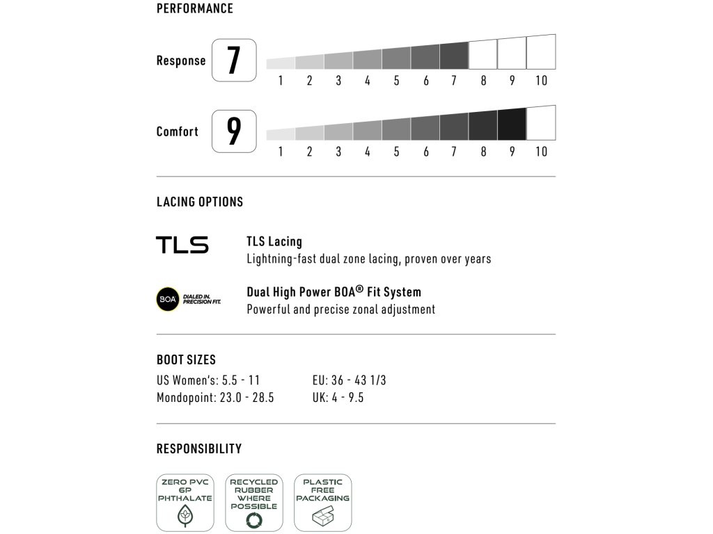 Novinka letošní sezóny bota Fate zvedá laťku komfortu a odolnosti pěkně vysoko, tak hlavně dávej bacha, abys neomdlela úžasem, až se ti dostane do rukou její lehká konstrukce. Byla navržena tak, aby dokonale obepla nohu, poskytla oporu a teplo. To vše bez ztráty pohodlí. Pro ženy speciálně navržená podrážka VIBRAM ECOSTEP má vynikající trakci i na kluzkém povrchu, je extrémně odolná a k tomu vyrobena z až 50 % z recyklovaného materiálu. Vzduchový polštář pod patou ztlumí veškeré otřesy způsobené jízdou, které i díky odlehčené dámské EVA mezipodešvy prostě neucítíš ani po celodenním shredu. To vše šetří tvoje nohy a tak můžeš jezdit od prvního lana až do večerka. Vnitřní přemodelovaná vložka Cloud 9 má perfektní termoizolační vlastnosti, 3D tvarovaný jazyk i oblast paty a je tepelně tvarovatelná. Vylepšená Ortholite® stélka o dvojí hustotě materiálu se zvýšenou oporou paty dodá tvé jízdě na jistotě a pohodě, navíc je antibakteriální a dá se prát. ILS šněrování vnitřní botky s Re/Lace zámkem se dá kdykoli bez problémů dotáhnout, aniž byste museli povolovat celou botu. Solo Laceglider společně s 45° Laceglider dotáhne tvoji botu k dokonalému utažení. Základem pořádného snowboardingu jsou ale nohy v teple. Stará se o to mimo jiné Therminator Shield fólie, která chrání chodidlo. Teplo zůstává uvnitř a chlad nemá šanci. * DÁMSKÁ VIBRAM® PODRÁŽKA VYROBENÁ Z VIBRAM® ECOSTEP™ * DÁMSKÁ EVA MEZIPODEŠEV * DÁMSKÉ TLUMENÍ AIR DAMPENING * TERMOIZOLAČNÍ VRSTVA THERMINATOR SHIELD * FLEX LINK DESIGN * SOLO LACEGLIDER * 45° LACEGLIDER * UTAHOVÁNÍ TLS TWIN LACING SYSTÉM, TVAROVANÁ TLS TÁHLA * BAIL OUT SYSTÉM * INOVOVANÁ, VNITŘNÍ TEPELNĚ TVAROVATELNÁ BOTIČKA (VLOŽKA) CLOUD 9 * ILS UTAHOVÁNÍ VNITŘNÍ BOTIČKY, RE/LACE ZÁMEK UTAHOVÁNÍ BOTIČKY * ORTHOLITE® HIGH CUP STÉLKA Z MATERIÁLU DVOU HUSTOT * TVRDOST: 7.