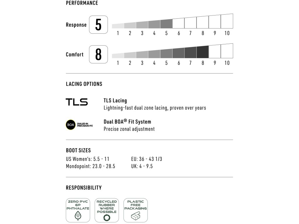 Boty Monarch jsou perfektní ukázkou funkčního stylu, vytvořené pro celodenní pohodlí a podporu při jízdě po všech svazích, s grácií a ladností. Boty Monarch přicházejí s jednoduchým, ale účinným utahováním, přiměřenou flexí a pohodlím, které ucítíte hned při prvním nazutí. Vaše nohy se budou rozpouštět blahem, až pocítí komfort teplem tvarovatelných vložek Cloud 3, které mají perfektní termoizolační vlastnosti, 3D tvarovaný jazyk i patu, paměťové panely kolem kotníků z latexu a pružnou konstrukci držící tvar i tvoji nohu na místě. Nadto jsou příjemně lehké. Přední panel Flex Toe zajistí dostatek prostoru pro prsty. Nízkoprofilová, efektně vypadající podrážka je kombinací superlehké tlumící a tepelně izolující EVA a odolné a přilnavé gumy. Dual BOA® Twin šněrování kombinované s Bail Out systémem usnadňuje vstup i rozšněrování a vystoupení z boty, které bude trvat méně než minutu. * EVA PODRÁŽKA DOPLNĚNÁ ODOLNÝMI IMPACT PANELS Z GUMY * UTAHOVÁNÍ TLS TWIN LACING SYSTÉM, TVAROVANÁ TLS TÁHLA * BAIL OUT SYSTÉM * DÁMSKÁ VNITŘNÍ TEPELNĚ TVAROVATELNÁ BOTIČKA (VLOŽKA) CLOUD 3 LINER * DLS UTAHOVÁNÍ VNITŘNÍ BOTIČKY, RE/LACE ZÁMEK UTAHOVÁNÍ BOTIČKY * DÁMSKÁ ANATOMICKY TVAROVANÁ STÉLKA * TVRDOST: 5.