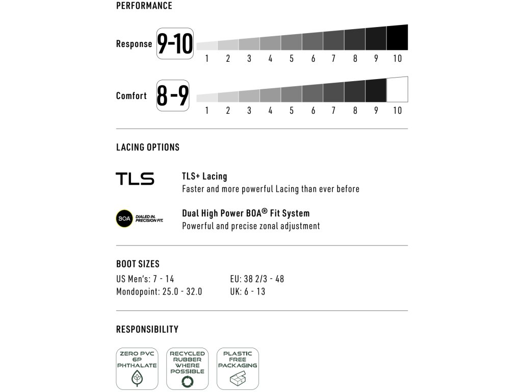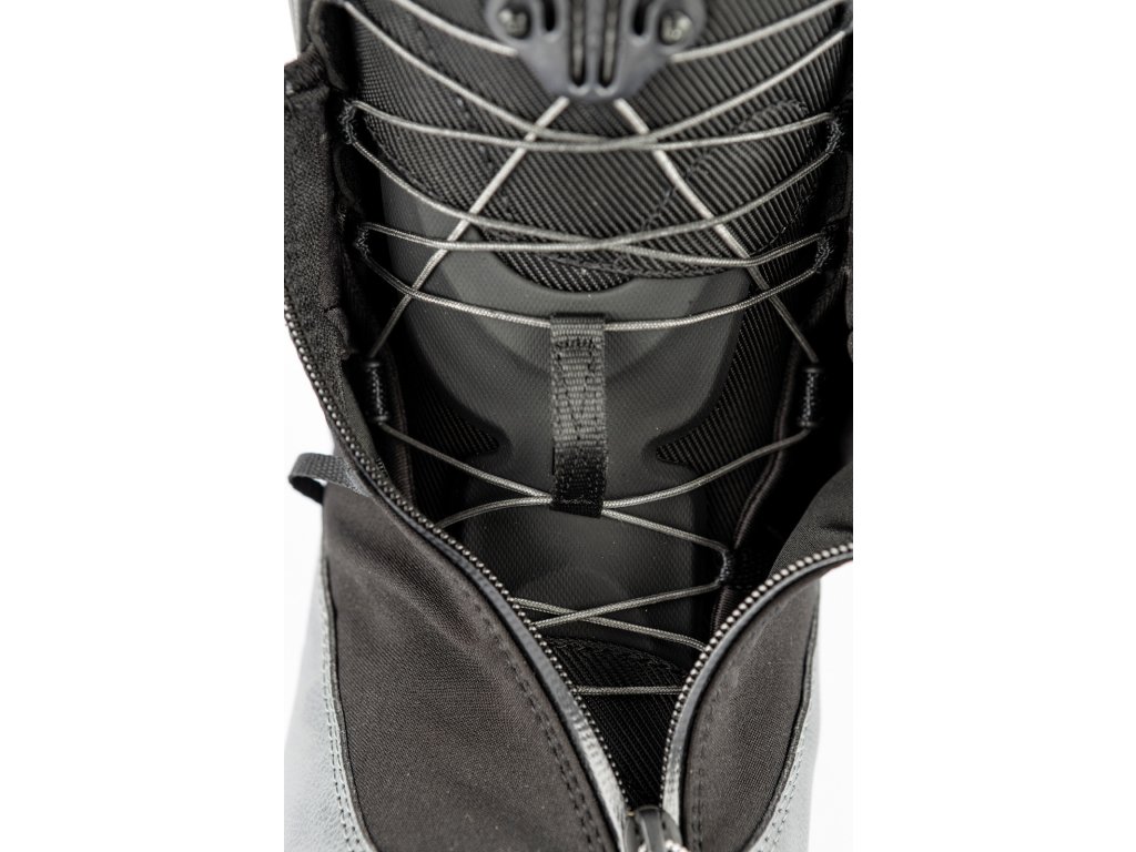 Naše nejoblíbenější a nejodolnější boty pro agresivní jízdu ve vylepšeném hávu. Boty Nitro Select vždy bořily hranice a tohoto trendu se držíme i letos. Naši jezdci si Select do velkých hor vybírají i kvůli plastovému zpevnění kolem kotníku, které umocňuje reakční schopnost boty a umožňuje přesnější dávkování utahovací síly. Podrážka Vibram ECOSTEP z recyklované gumy déle vydrží a neklouže. Její součástí je i tlumící polštář D3O. Letošní model jsme poprvé vybavili světovým unikátem a raritou, stélkou Ortholite® O-Therm o trojí hustotě materiálů. Ta se pyšní polyuretanovou pěnou s otevřeným komorovým systémem obohaceným o Aerogel, díky čemuž udrží tepelný komfort za každého počasí. V horku se ploska nohy nepřehřívá a v zimě naopak stélka neztrácí teplo a funguje jako tepelný štít. Extrémně lehká konstrukce je momentálně nejúčinějším termoregulačním materiálem na trhu a ve spojení se zvýšenou oporou paty dodá tvé jízdě na jistotě a pohodě. Nová generace dvoustupňového systému utahování tkaniček TLS má inovovaný, odolný zámek, speciálně designovaný tak, aby v něm tkaničky pevně držely a nepovolily ani po celodenní palbě. Tomu napomáhá i vylepšená úprava Dyneemy pro bezchybný chod se sníženým třením, čímž se materiál jen tak neopotřebuje a déle vydrží. Samozřejmostí je Bail Out systém usnadňující rozšněrování a vystupování z bot a ILS šněrování vnitřní botky s Re/Lace utahováním. Prostě jen vyhrnete kalhoty a zatáhnete za tkaničku. Vyztužení svršku boty v kombinaci vyjímatelným ztvrďovákem jazyka jsou ideálními pomocníky na cestě k perfektně vyříznutému dlouhému oblouku. 45° Laceglider zajistí pevné dotažení tkaničky a zvýší její životnost. Letošní model jsme doplnily o ochrannou légu na zip, která brání sněhu a vlhku vniknout dovnitř boty. * VIBRAM® PODRÁŽKA VYROBENÁ Z VIBRAM® ECOSTEP™, DOPLNĚNÁ D3O® TLUMÍCÍMI PRVKY, EVA MEZIPODEŠEV * TLUMENÍ AIR DAMPENING * TERMOIZOLAČNÍ VRSTVA THERMINATOR SHIELD * ARMORED SHELL * FLEX LINK DESIGN * 45° LACEGLIDER * AUTO-POWER PÁSEK * TLS POWERCORD TWIN LACING SYSTÉM, TVAROVANÁ TLS TÁHLA, BAIL OUT SYSTÉM * INTEGROVANÁ PODPORA KOTNÍKU * NASTAVITELNÁ TVRDOST JAZYKA * OCHRANNÁ LÉGA NA ZIP * TEPELNĚ TVAROVATELNÁ VNITŘNÍ BOTIČKA CLOUD 9 * ILS UTAHOVÁNÍ VNITŘNÍ BOTIČKY, RE/LACE ZÁMEK UTAHOVÁNÍ BOTIČKY * ORTHOLITE®HIGH CUP STÉLKA S O-THERM Z MATERIÁLU TŘECH HUSTOT * TUHOST: 9-10.
