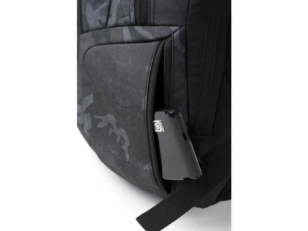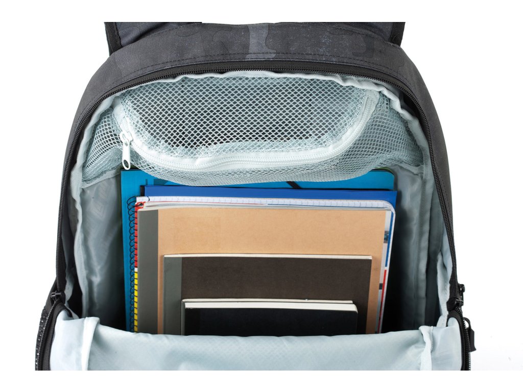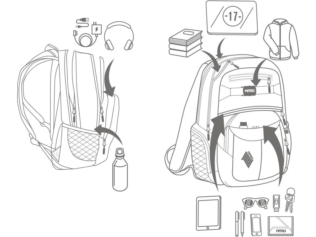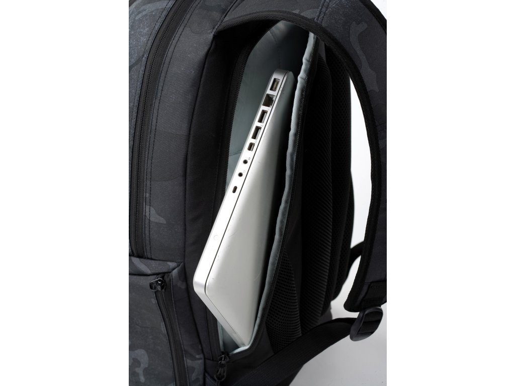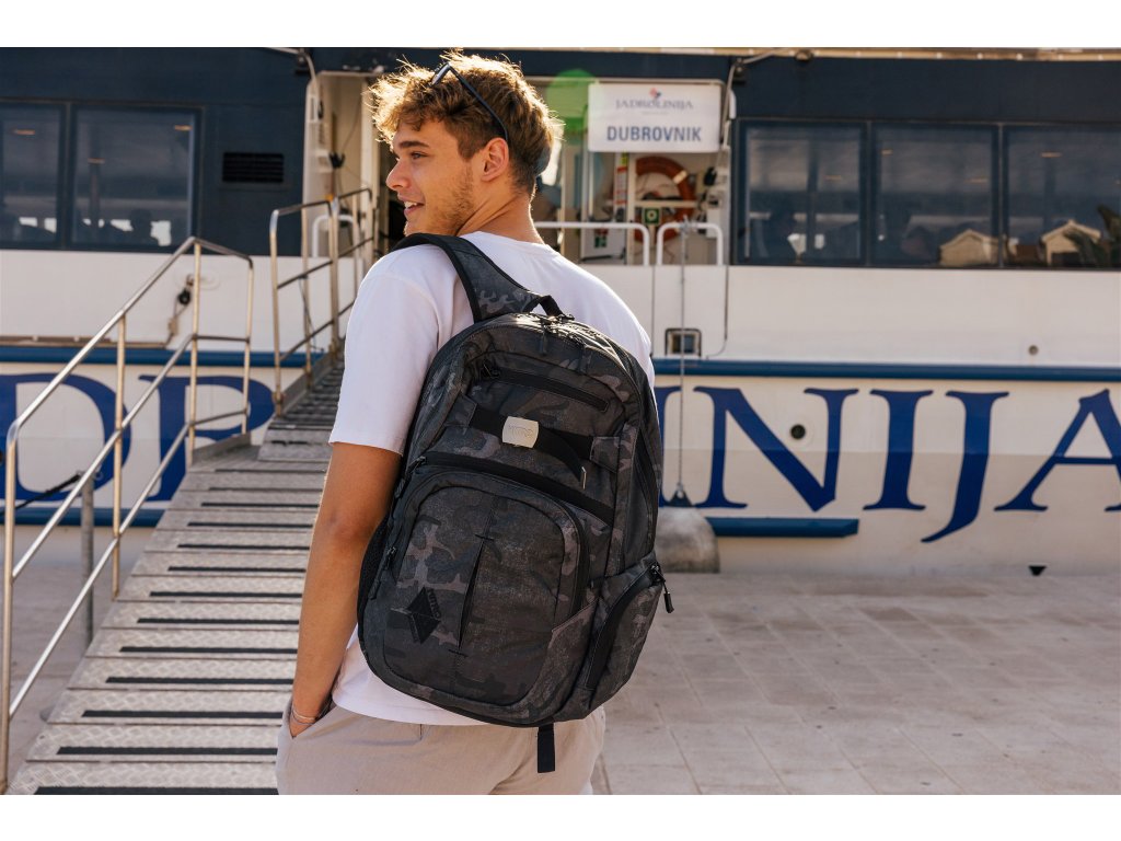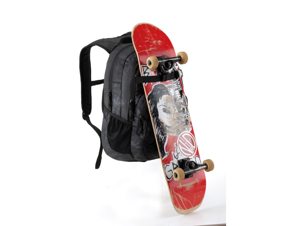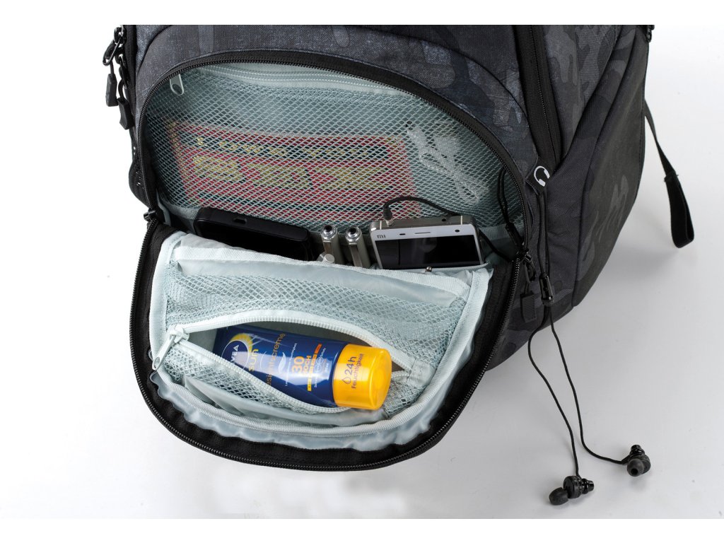 Fleecem vystlaná kapsa na brýle a podobně choulostivé věci, dvě hlavní prostorná oddělení, kapsa na tablet, vypolstrovaná kapsa na 17" notebook, popruh na nesení skateboardu, postranní kapsa na zip, postranní síťovinová kapsa na lahev. Objem 37 l. Rozměry přibližně 52 x 38 x 23 cm. Hmotnost 980 g.