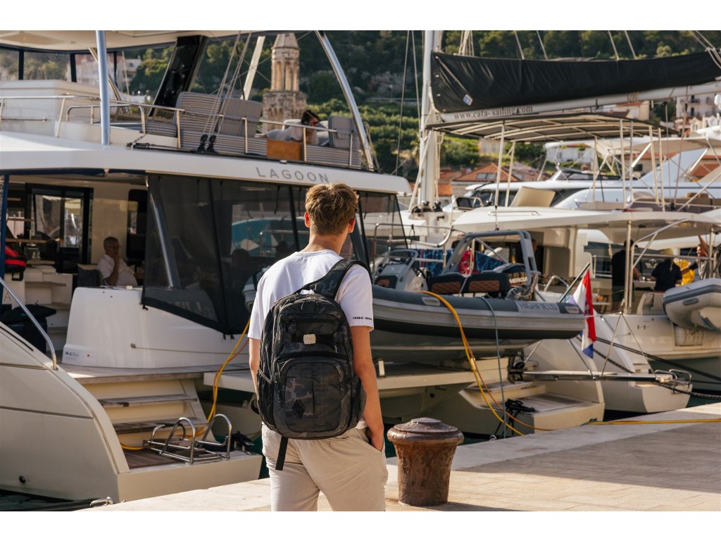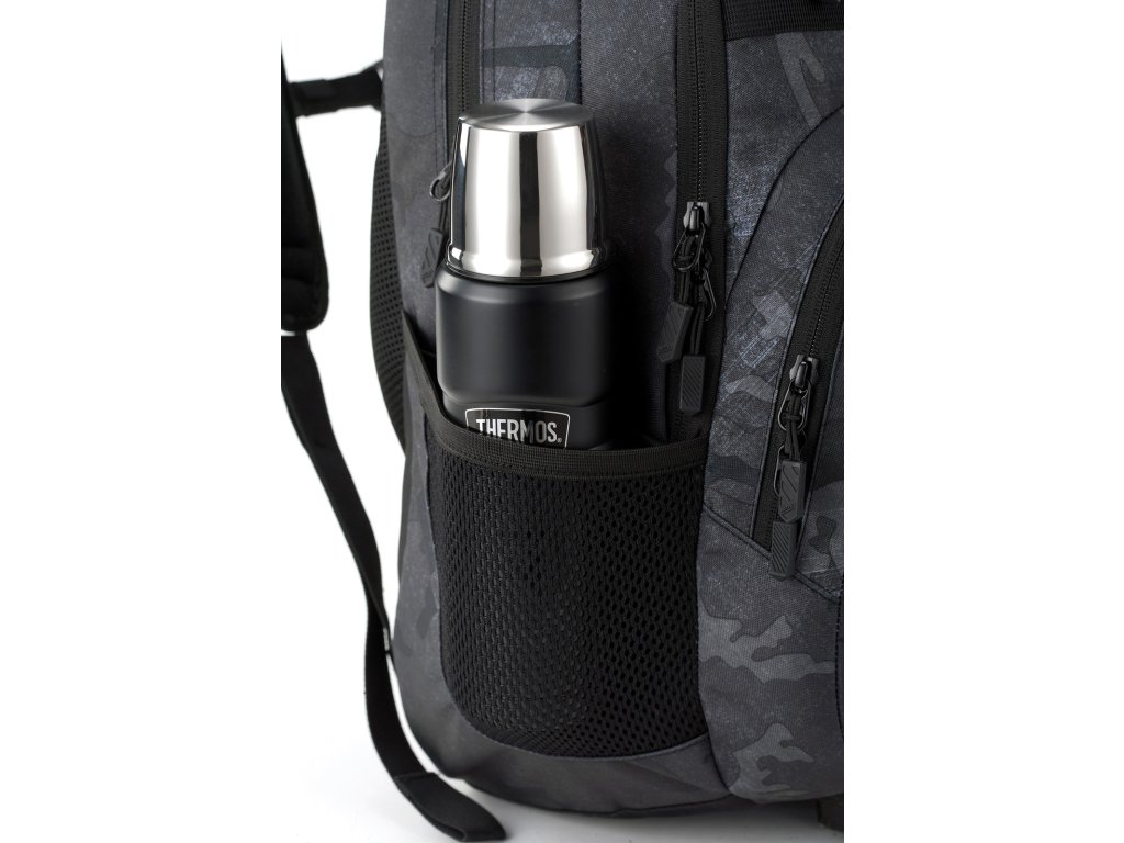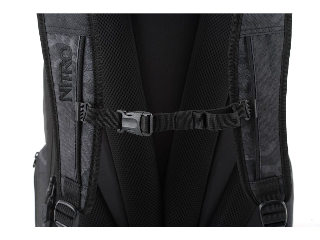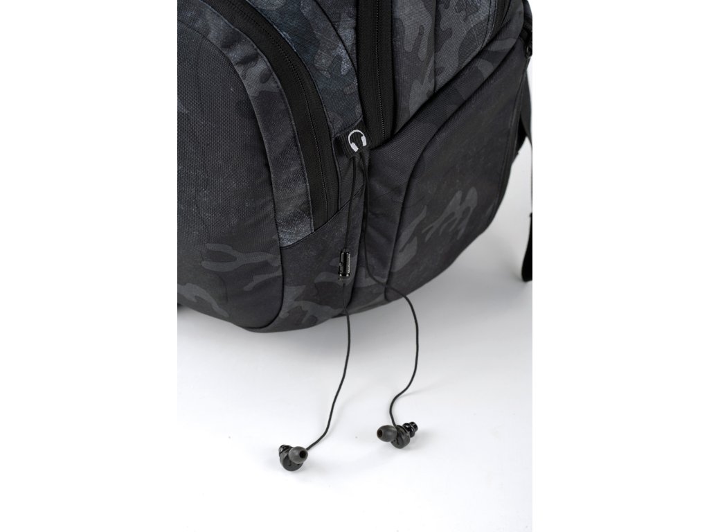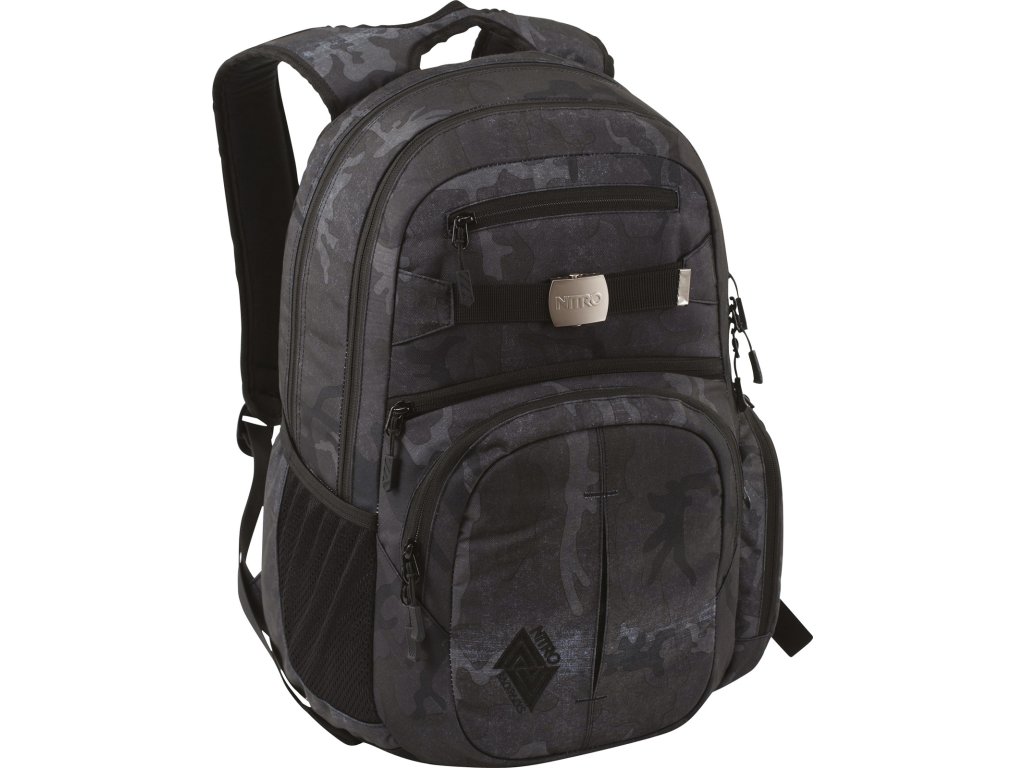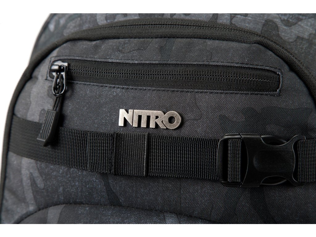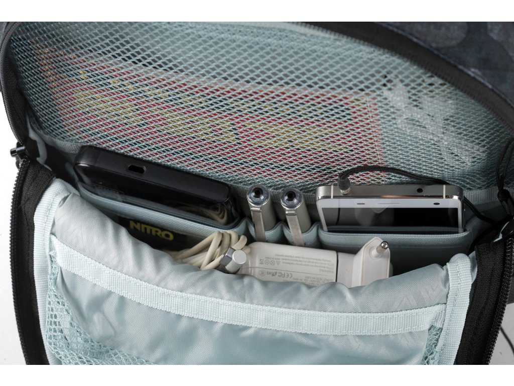 Fleecem vystlaná kapsa na brýle a podobně choulostivé věci, dvě hlavní prostorná oddělení, kapsa na tablet, vypolstrovaná kapsa na 17" notebook, popruh na nesení skateboardu, postranní kapsa na zip, postranní síťovinová kapsa na lahev. Objem 37 l. Rozměry přibližně 52 x 38 x 23 cm. Hmotnost 980 g.