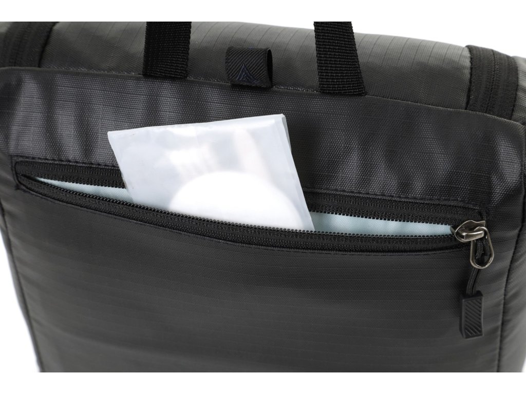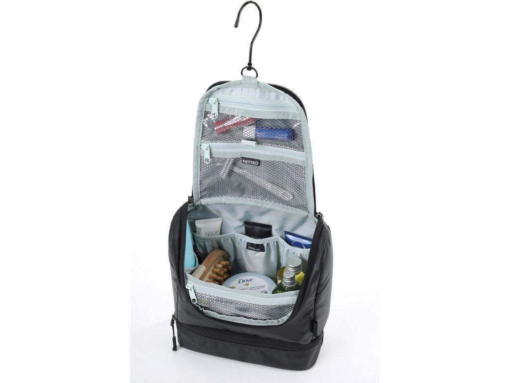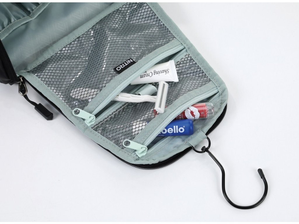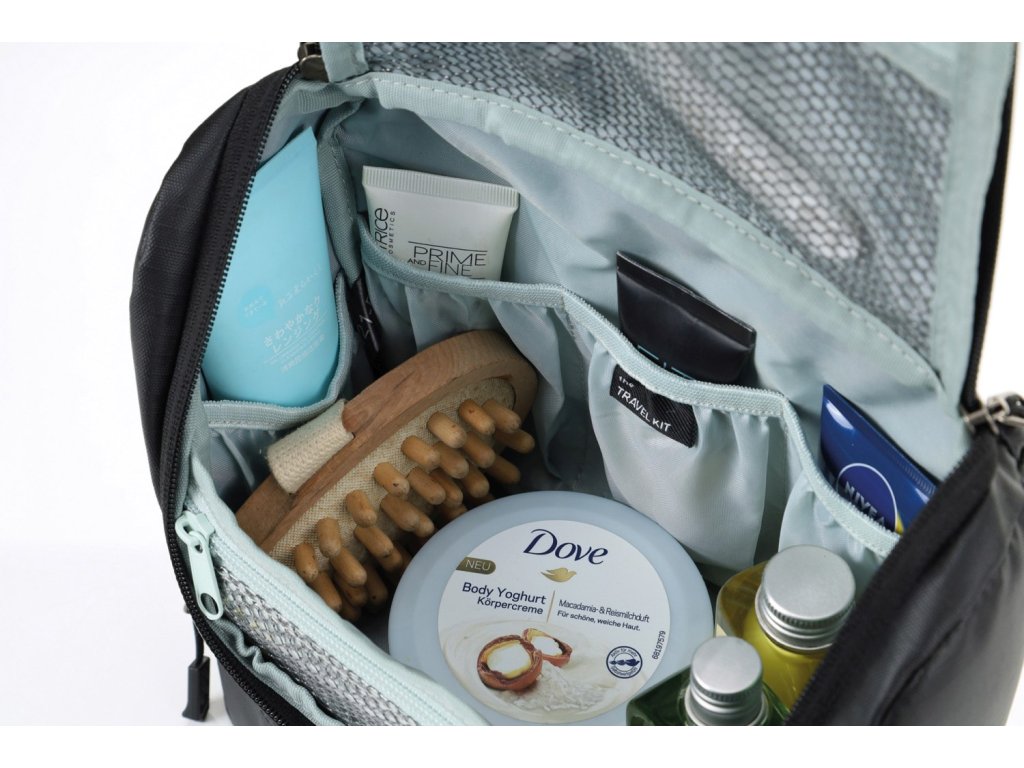Cestovní, toaletní taška s háčkem k zavěšení a praktickým vnitřním uspořádáním. Hlavní prostor obsahuje 3 průhledné kapsičky na zip a fochy na zastrčení zubního kartáčku, pasty atd. V dolní části je další oddělený prostor na zip. Na zadní straně je další kapsička na zip. Rozměry 25 x 24 x 11 cm.