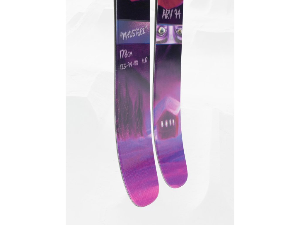 Seznamte se s velmistrem zábavy a multifunkčním nástrojem, který zvládne doslova cokoliv. Lyže ARV 94 sebevědomě nahrazuje svou předchůdkyni ARV 96, která byla kompletně překopána a my ti tak můžeme nabídnout tohohle hodně barevnýho fénixe. Po důkladném testování jednoho prototypu za druhým a celé řádce rozhovorů s našimi jezdci, trenéry i konstruktéry jsme si jistí, že na jízdu s touhle kráskou jen tak nezapomeneš. Ve výrobě byl zcela poprvé použit revoluční přístup k integraci sidewallů do jádra (w3Dgewall), které díky zkosení vytváří kompaktní a rovnoměrné spojení materiálů po celé délce lyže a přináší odolnost v tahu i nárazu, která nemá na trhu obdoby. Oproti minulým modelům je lyže ve výsledku o 63 % nezničitelnější a připravená na pořádnou freestylovou nakládačku. Osazení ultralehkým Caruba jádrem má za následek sražení váhy o krásných 200 g a v kombu s osvědčeným AR Freestyle Rockerem s přizvedlou špičkou i patkou znamená jistou a stabilní jízdu bez zakousnuté hrany jak na perfektně přimrzlé rampě a vyshapovaných skocích, tak při resortovém tóču na rozbité černé. Štědrý rádius umožní konzistentní kontakt našich bytelných 2.5 Impact hran s povrchem a sintrovaná skluznice S7 vydrží všechno, tvé přejíždění přes surový beton i broušení nejdelších railů světa a stále zůstane skvěle voskovatelnou. Lehce měkčí flex je pečlivě vybalancován pro ty nejepičtější buttery a pressy, zároveň je stále dostatečně tuhý pro solidní pop i palbu vítězné lajny parkových happeningů. Další povedenou inovací je inkorporace jasanového dřeva do základny vázání pro jeho jistější upevnění a delší životnost. Přidána kratší délka 157 cm, aby si mohli užít pořádný lyžování i menší bytosti a především naše juniorská omladina. Flex lyže: špička 6; pod botou 7; patka 7. Parametry lyže při délce 157 cm: 122 / 94 / 115 mm, radius 15,5 m, hmotnost jedné lyže 1 510 g; 164 cm: 122 / 94 / 116 mm, radius 16 m, hmotnost jedné lyže 1 600 g; 171 cm: 122 / 94 / 117 mm, radius 16,5 m, hmotnost jedné lyže 1 720 g; 178 cm 123 / 94 / 118 mm, radius 17 m, hmotnost jedné lyže 1 800 g; 185 cm: 124 / 94 / 119 mm, radius 17,5 m, hmotnost jedné lyže 1 880 g. O design se postaral kalifornský mistr spreje a surfu Madsteez.
