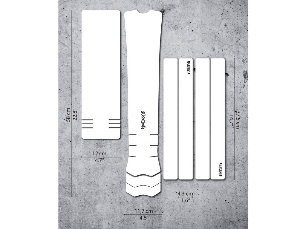 V kitu naleznete za super peníz opravdu hodně muziky! 6 kusů ochranné folie standardizované pro všechny kola na trhu. Hlavní díl pro horní rámovou + další 2 kratší díly pro extra dlouhé rámové trubky nebo jiné části základního trojúhelníku. Další velký průhledný díl na spodní rámovou trubku a 4 kusy folie pro řetězové a sedlové vzpěry. Stačí pak jen vzít nůžky a doladit k obrazu nebo spíš kolu svému.