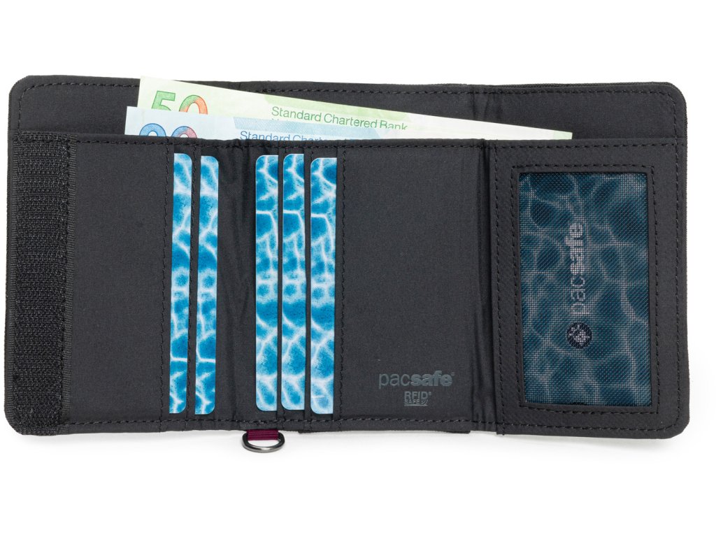 Skládací peněženka na všechny světové měny. Materiál blokující RFID ochraňuje vaše karty (v 6 slotech) před nenechavci. Snadno přístupná kapsa na mince na zádech peněženky. Přihrádka na ID s průhlednou síťovinou. Všechno navíc drží pohromadě suchý zip. Očko na karabinu. Vyrobeno ze 2 recyklovaných plastových lahví.