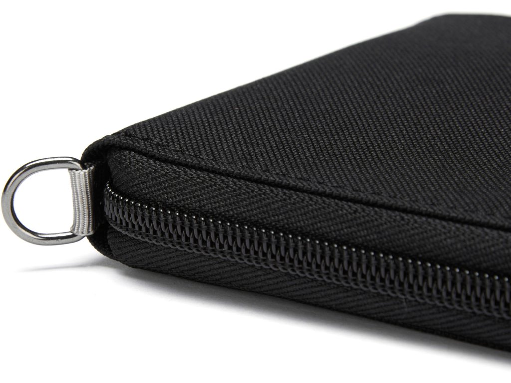 Z téhle peněženky se nic bez vašeho svolení nedostane! Postará se o to zip po celém obvodu a materiál chránící vaše informace z dokladů a kreditek před nežádoucím skenováním signálu RFID. Do lehce přístupné kapsičky na zadní straně lze uložit jízdenky nebo lítačku. Vnější kovový kroužek můžete využít k uchycení peněženky bezpečnostním a proti přeříznutí odolným Pacsafe páskem (není součástí balení) nebo jím peněženku jednoduše připnout dovnitř batohu.