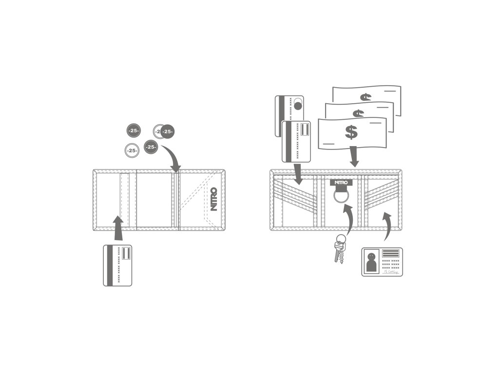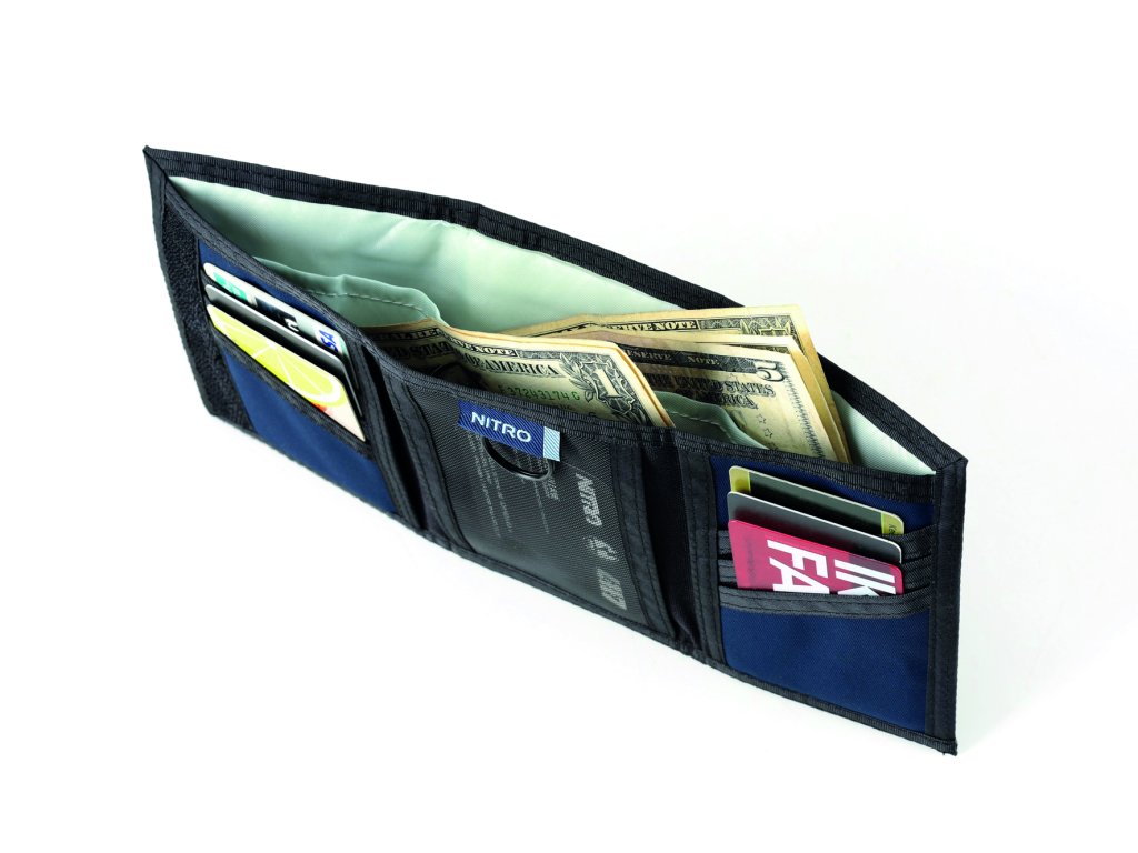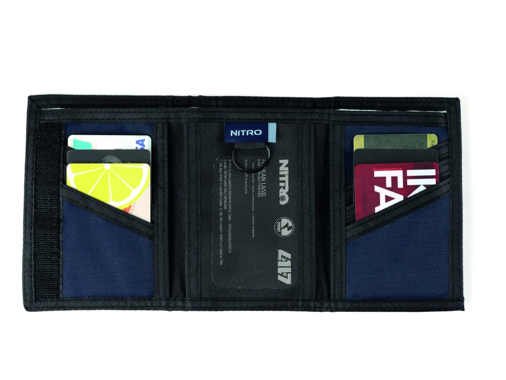 Textilní peněženka na suchý zip. Kapsička na drobné na zip, kapsa na doklady, přihrádky na karty, očko na klíče, či řetízek. Velikost 14x10 cm. Materiál 600D polyester. Hmotnost 60 g.