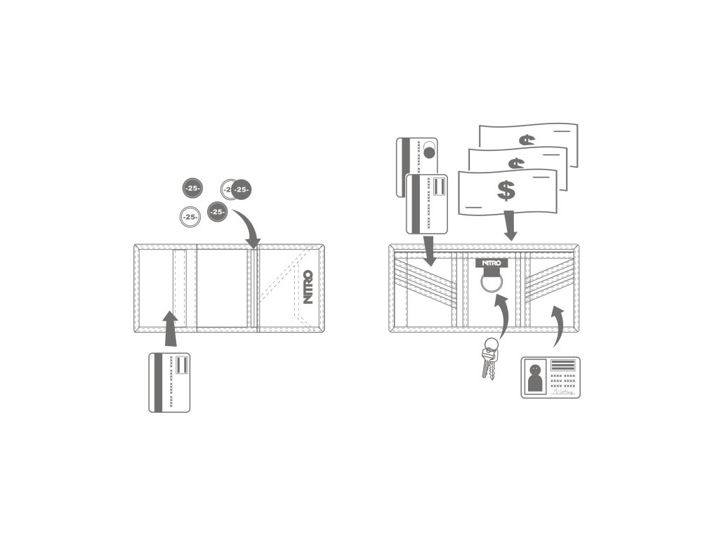 Textilní peněženka na suchý zip. Kapsička na drobné na zip, kapsa na doklady, přihrádky na karty, očko na klíče, či řetízek. Velikost 14x10 cm. Materiál 600D polyester. Hmotnost 60 g.