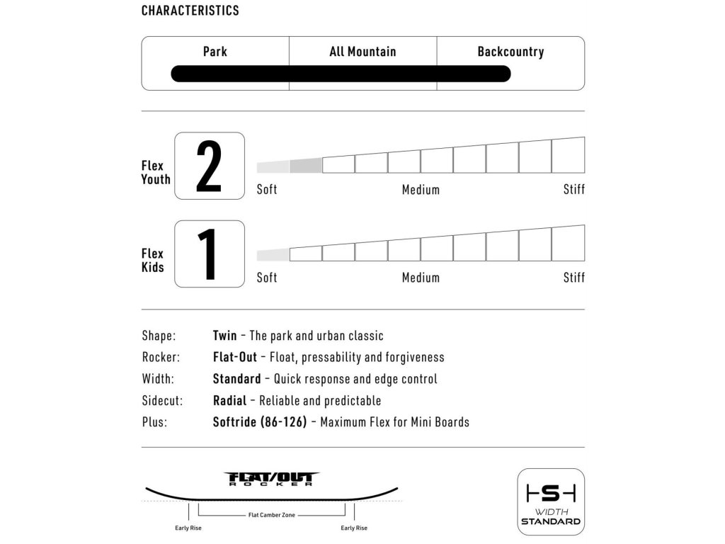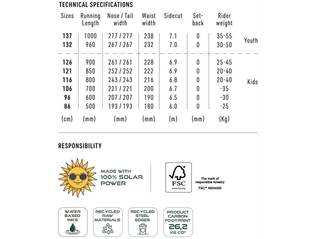 Prkno, na kterém je zábava se učit. Flat-Out Rocker předchází nechtěnému zakusování hrany, snadno navazuje oblouky, lehce brzdí. Díky této konstrukci si vaše ratolesti podmaní celé hory a v pohodě absolvují i první krůčky, skůčky a slajdíky ve snowparku. Mladí dravci se na Ripperu snadno naučí ovládat snowboard na hraně a brzdit i kontrolovat rychlost jízdy. Velice brzy se tak stanou plnoprávnými členy vaší jezdící rodiny. Přesnou jízdu bez nečekaných zádrhelů a zákusů přináší Flat-Out Rocker. Pružnost prkna – Softride Flex – je nastavena tak, aby se přirozeně ohýbalo pod dětmi všech velikostí, které se chtějí celé dny bavit skotačením na sněhu. Toto Twin prkno pomáhá těm nejmladším rychle dohnat zkušenější jezdce. Ripperem začíná snowboarding! Letos jsme naše snowboardy opuncovali zeleným kolkem udržitelnosti a opatřili všechna prkna materiály přátelskými k naší planetě, recyklovanými hranami a v celém výrobním procesu využily pouze solární energii. * TVAR: TWIN * ROCKER: FLATOUT * ŠÍŘKA: STANDARD * YOUTH PRUŽNOST: SOFTRIDE, 1/10 * VYKROJENÍ: RADIAL * POWERCORE, BI-LITE LAMINÁT, SKLUZNICE PREMIUM EXTRUDED FH.