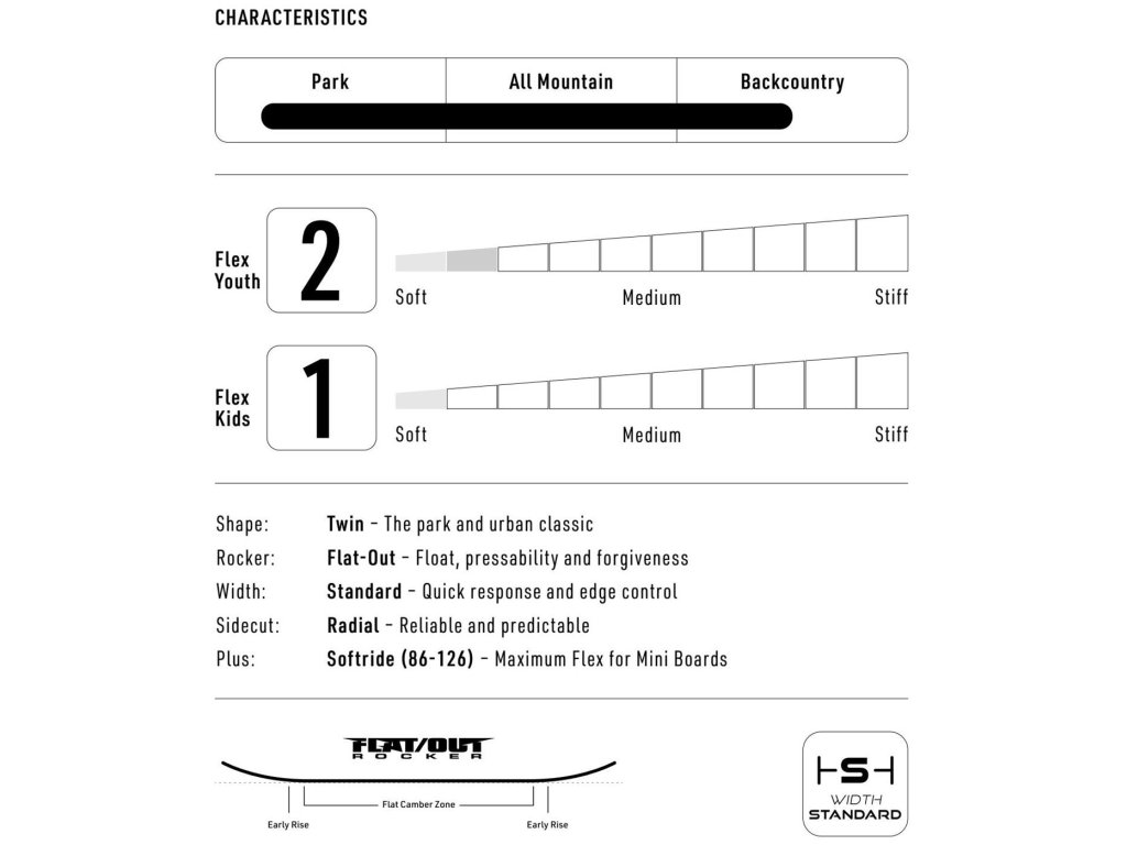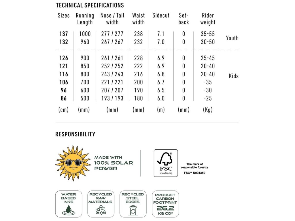 Prkno, na kterém je zábava se učit. Flat-Out Rocker předchází nechtěnému zakusování hrany, snadno navazuje oblouky, lehce brzdí. Díky této konstrukci si vaše ratolesti podmaní celé hory a v pohodě absolvují i první krůčky, skůčky a slajdíky ve snowparku. Mladí dravci se na nově reshapovaném Ripperu x Volcom snadno naučí ovládat snowboard na hraně a brzdit i kontrolovat rychlost jízdy. Velice brzy se tak stanou plnoprávnými členy vaší jezdící rodiny. Přesnou jízdu bez nečekaných zádrhelů a zákusů přináší Flat-Out Rocker. Pružnost prkna – Softride Flex – je nastavena tak, aby se přirozeně ohýbalo pod dětmi všech velikostí, které se chtějí celé dny bavit skotačením na sněhu. Toto Twin prkno pomáhá těm nejmladším rychle dohnat zkušenější jezdce. Ripperem začíná snowboarding! Letos jsme naše snowboardy opuncovali zeleným kolkem udržitelnosti a opatřili všechna prkna materiály přátelskými k naší planetě, recyklovanými hranami a v celém výrobním procesu využily pouze solární energii. * TVAR: TWIN * ROCKER: FLAT-OUT * ŠÍŘKA: STANDARD * YOUTH PRUŽNOST: SOFTRIDE, 1/10 * VYKROJENÍ: RADIAL * POWERCORE, BI-LITE LAMINÁT, SKLUZNICE PREMIUM EXTRUDED FH.