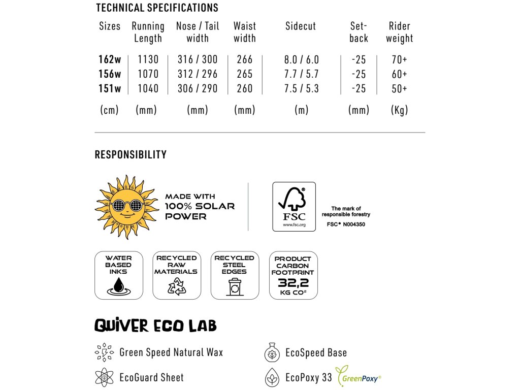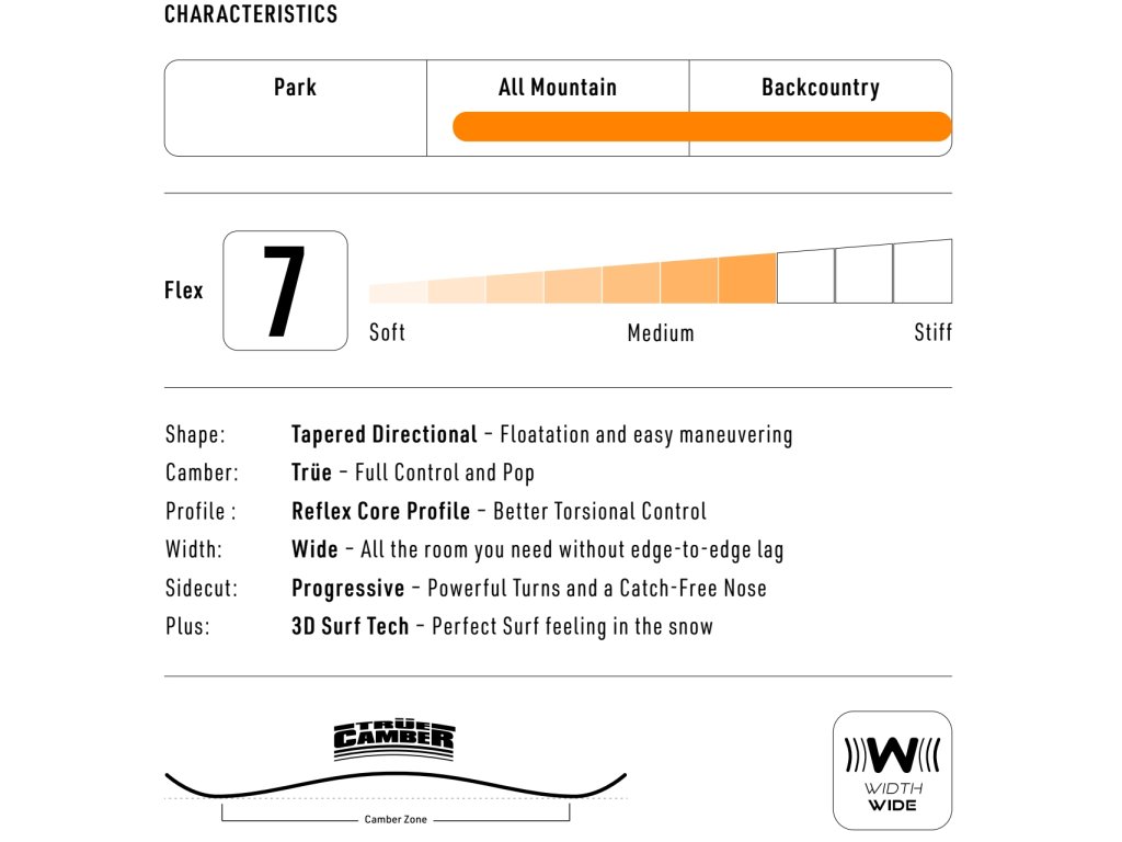 Evoluce Slashe se nezastavila a ty se můžeš těšit na dokonale vytvarované prkno, které nesmí chybět v bagu žádného fandy prachu a kárvu. 3D tvar špičky je protažený až k vázání, má inovovaný lžičkovitý profil, takže se ani v nejhlubším sněhu neponoří a jízda tak získá na neuvěřitelné neskutečnosti. Zároveň konkávní patka, True Camber a progresivní vykrojení napomůže bleskové akceleraci a zaručí rychlou manévrovatelnost při přechodu z hrany na hranu a přesné přenesení váhy v oblouku. To oceníš hlavně při kárvu na sjezdovce, ale i mimo ni, v břečce nebo ubitém sněhu. Koncept neobyčejného 3D Slasha je naprosto obyčejný. Pocit z perfektního průjezdu prašanem zaručen. A to i ve dnech, kdy zrovna moc nenapadlo. Revoluční 3D Surf Tech je něco, co musíš prostě zažít. Loni jsme celou Quiver sérii opuncovali zeleným kolkem udržitelnosti a opatřili všechna prkna materiály přátelskými k naší planetě. Skluznice Eco Speed Base je vyrobena z nové generace Eco Poxy 33 epoxidu založeném z 33 % na rostlinné bázi. K její výroběje z 85 % použito postprodukčních odřezků a zbytků, které tak dostávají druhou šanci a snižují tím množství spotřebovaných nových materiálů i odpadů. Na stejném principu je založen i Eco Guard Topsheet. Zelenou tečkou je pak biodegradovatelný přírodní Green Speed vosk pro hladký pojezd, recyklované hrany a v celém výrobním procesu využití pouze solární energie. * TVAR: TAPERED DIRECTIONAL * CAMBER: TRÜE * ŠÍŘKA: WIDE * PRUŽNOST: ALL TERRAIN, 7/10 * VYKROJENÍ: PROGRESSIVE * JÁDRO POWERCORE II, REFLEXNÍ PROFIL JÁDRA, BI-LITE LAMINÁT, SKLUZNICE SINTERED ECO SPEED FORMULA HD.