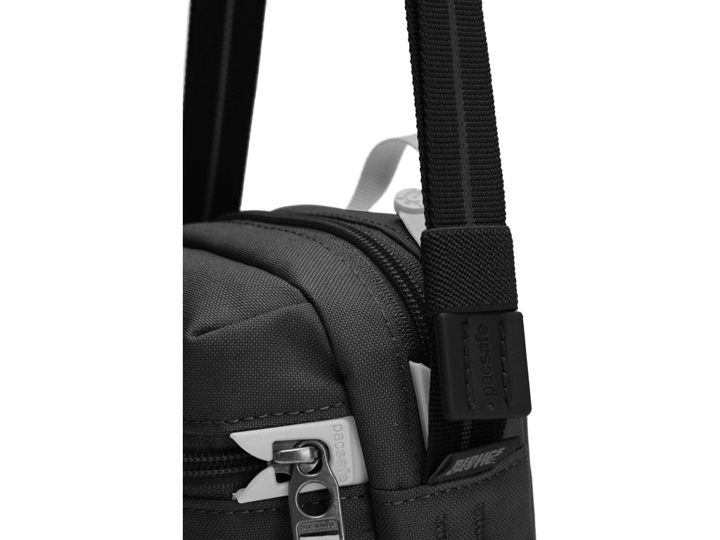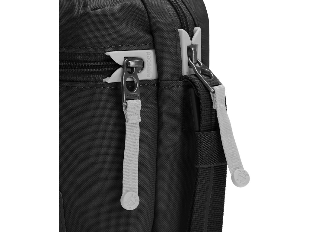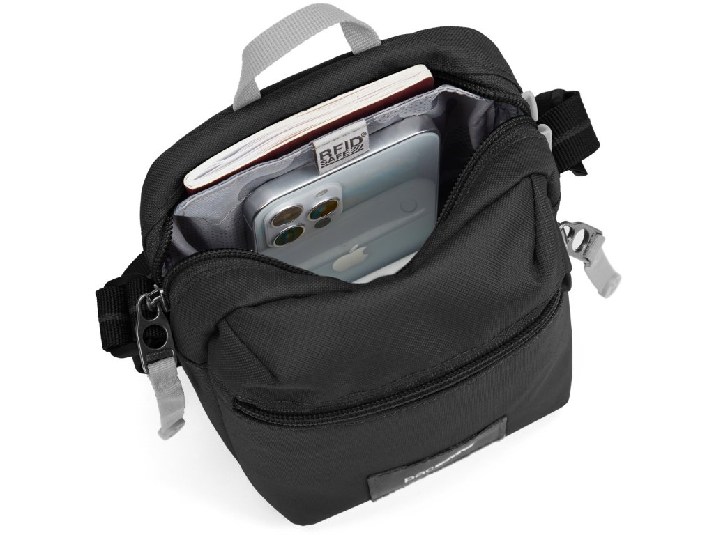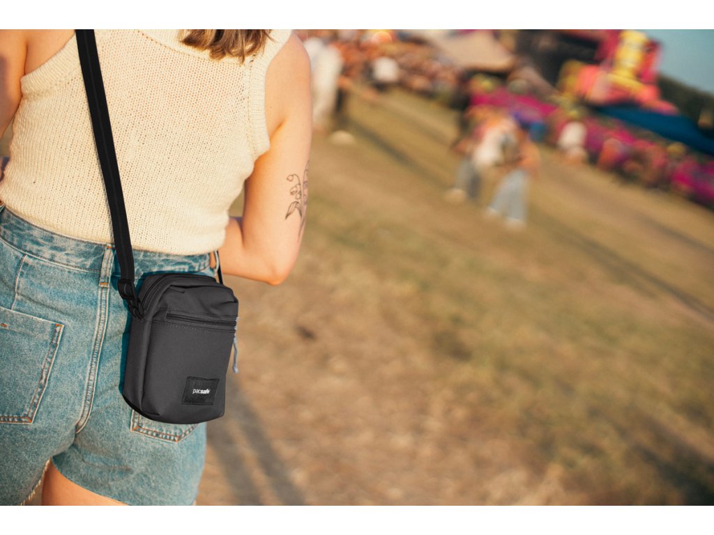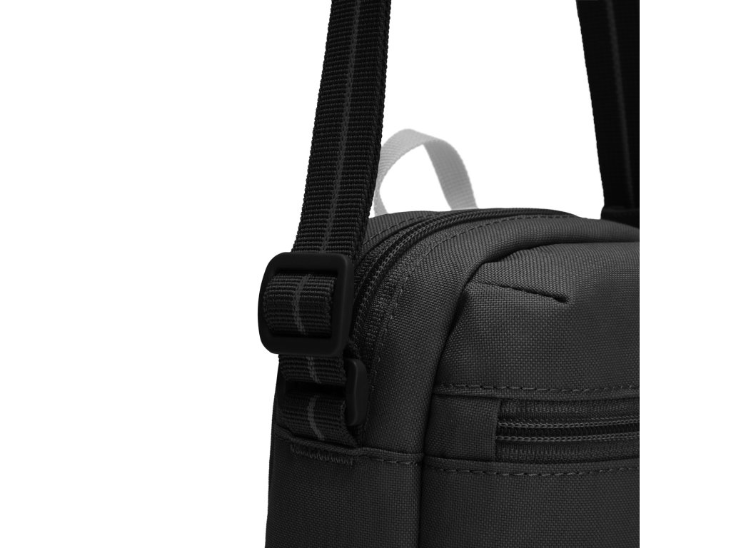 Ve chvílích, kdy máte raději volné ruce a s sebou jen to nejnutnější, se vám tato crossbody taška mikro velikosti bude hodit. Má dvě dokonale velké přihrádky, do kterých se vejde telefon, peněženka, klíče, sluneční brýle i sluchátka. Vše je zajištěno snadno uzamykatelnými zipy, kapsou s blokováním RFID a popruhem odolným proti proříznutí, který pomůže na cestách ochránit vaše cennosti. Tato taška je vyrobena z 5 recyklovaných plastových lahví.