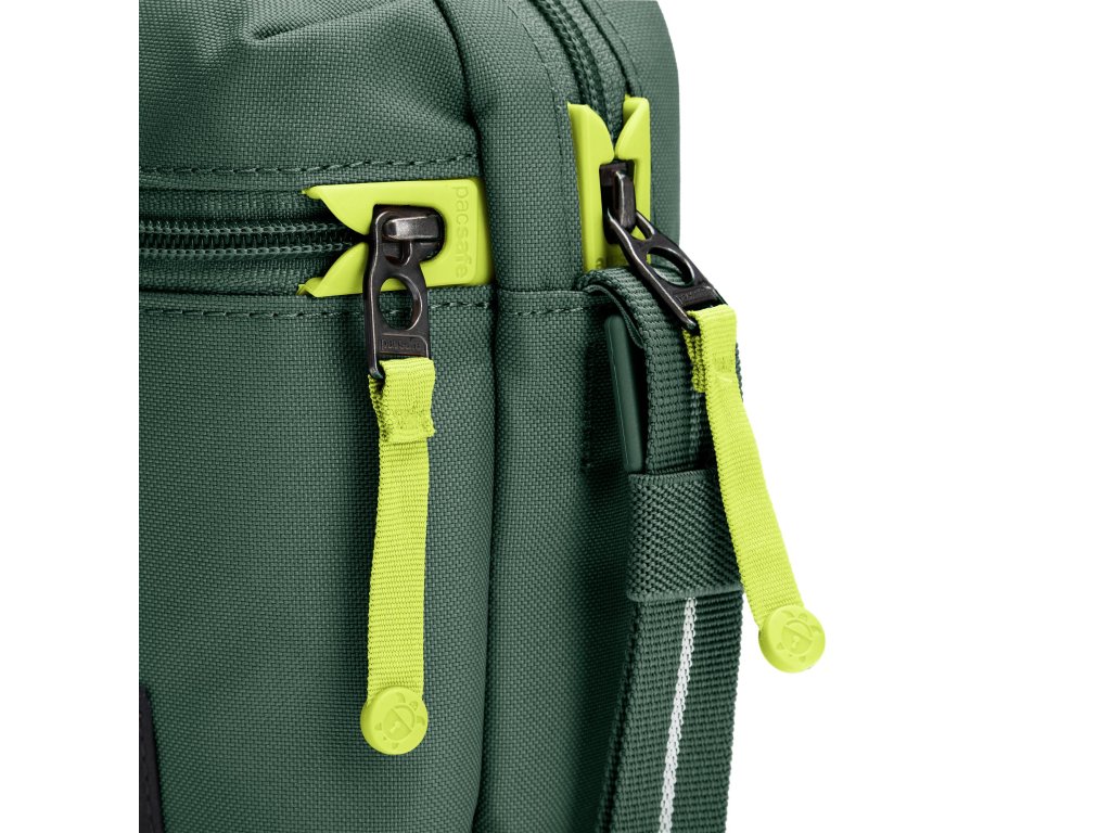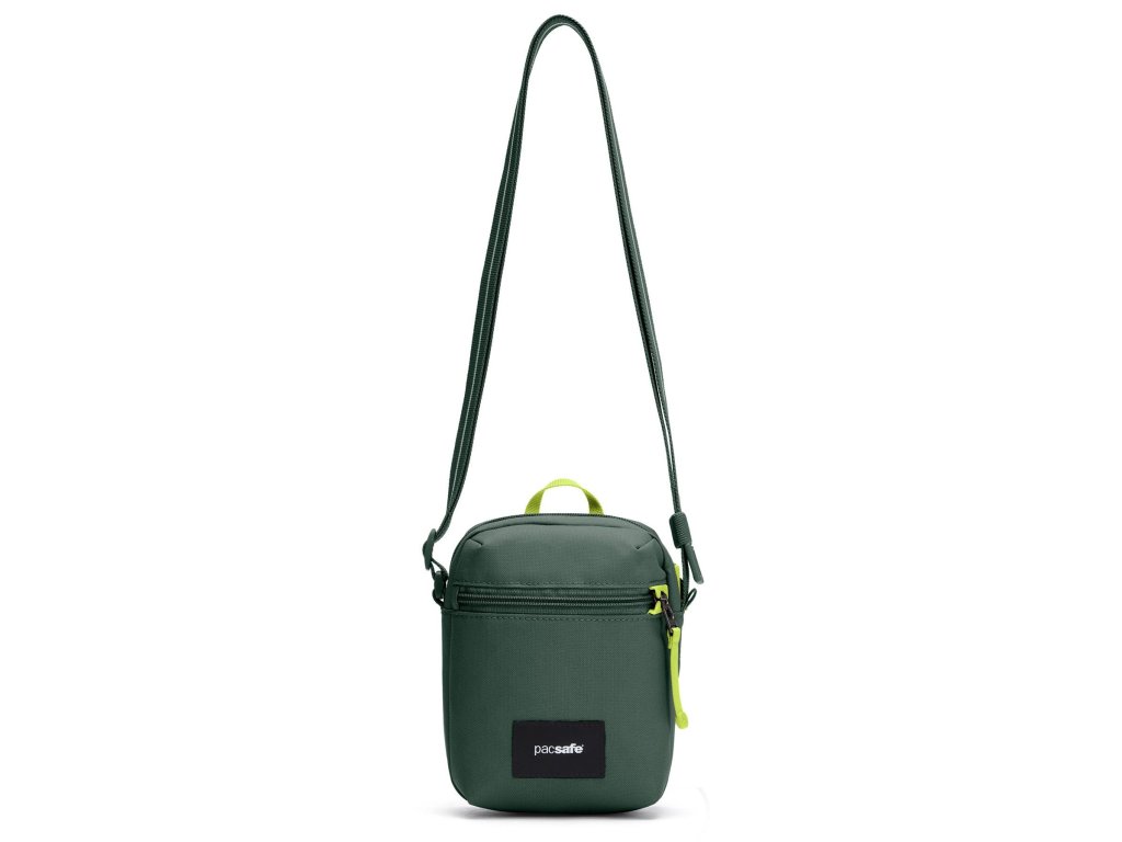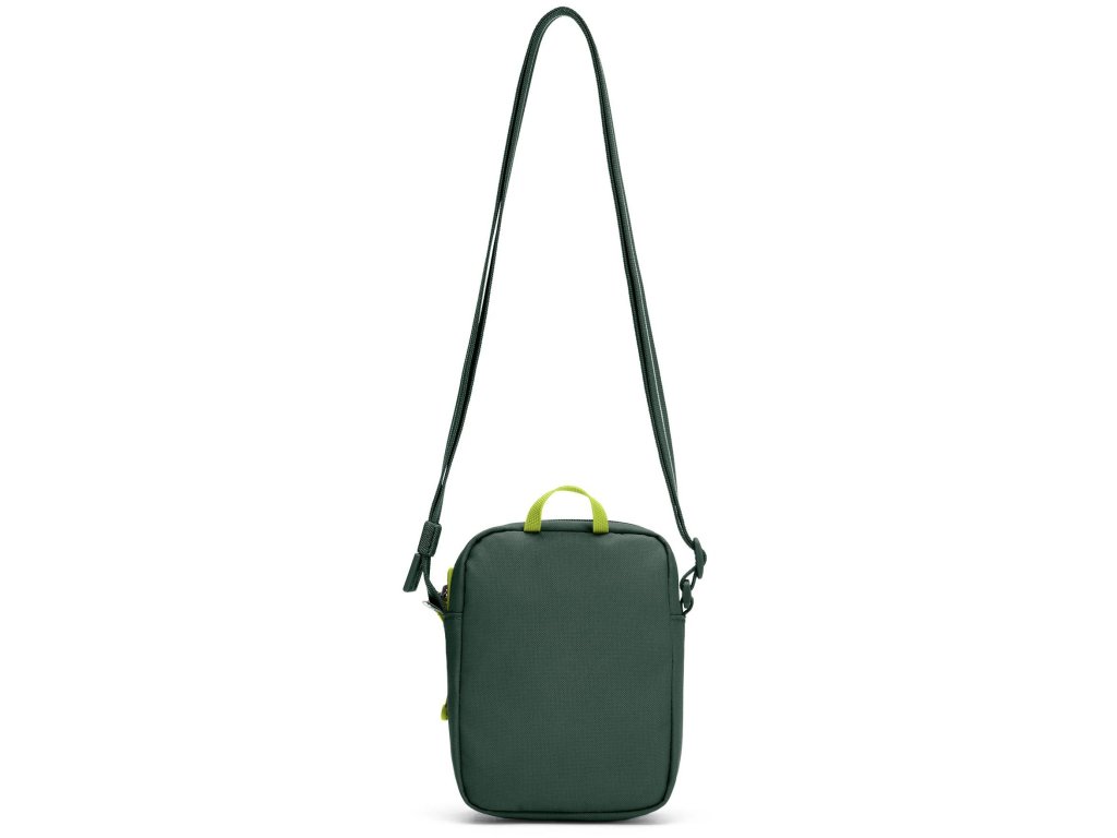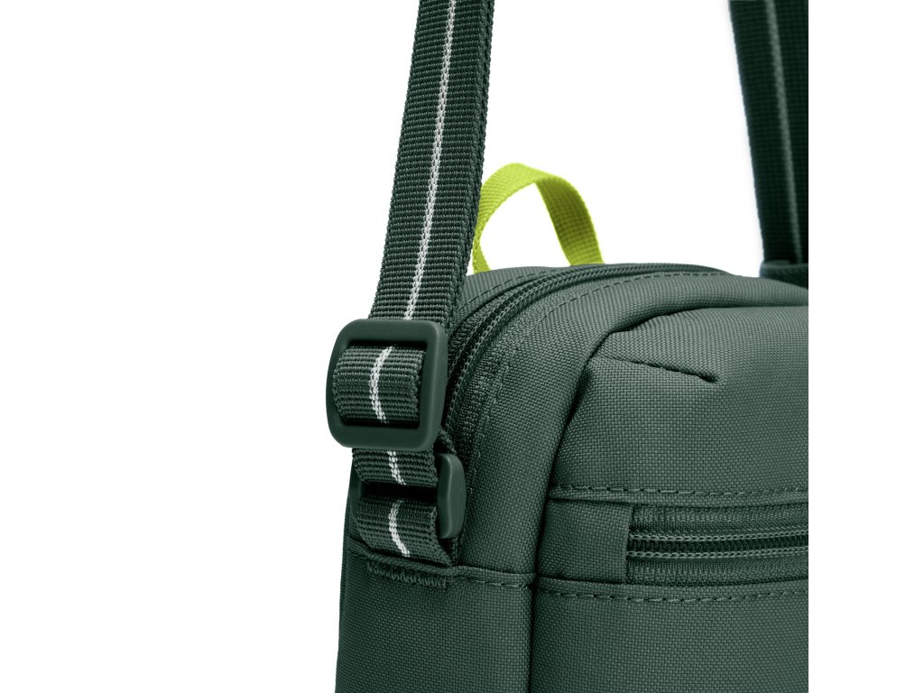 Ve chvílích, kdy máte raději volné ruce a s sebou jen to nejnutnější, se vám tato crossbody taška mikro velikosti bude hodit. Má dvě dokonale velké přihrádky, do kterých se vejde telefon, peněženka, klíče, sluneční brýle i sluchátka. Vše je zajištěno snadno uzamykatelnými zipy, kapsou s blokováním RFID a popruhem odolným proti proříznutí, který pomůže na cestách ochránit vaše cennosti. Tato taška je vyrobena z 5 recyklovaných plastových lahví.