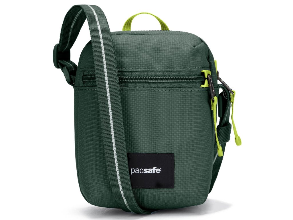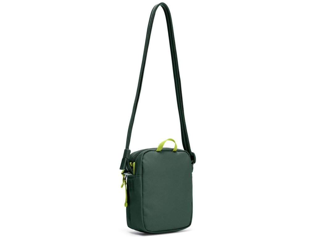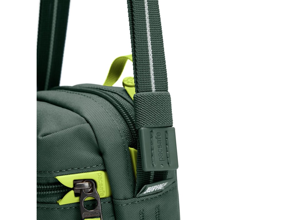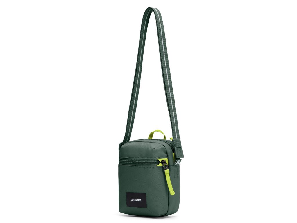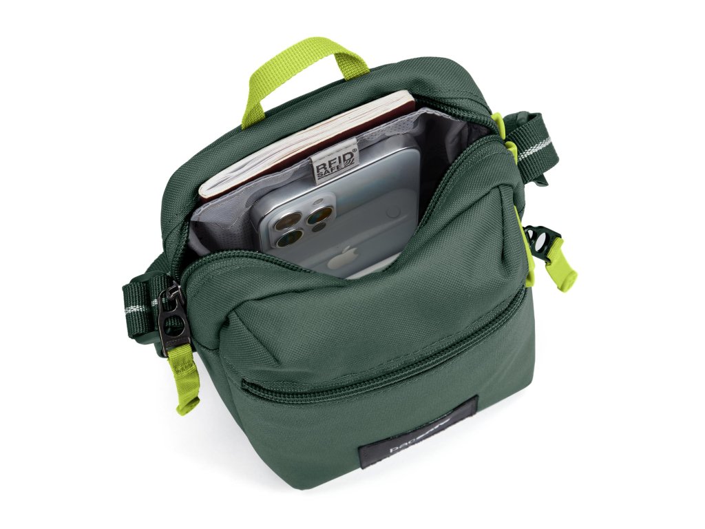 Ve chvílích, kdy máte raději volné ruce a s sebou jen to nejnutnější, se vám tato crossbody taška mikro velikosti bude hodit. Má dvě dokonale velké přihrádky, do kterých se vejde telefon, peněženka, klíče, sluneční brýle i sluchátka. Vše je zajištěno snadno uzamykatelnými zipy, kapsou s blokováním RFID a popruhem odolným proti proříznutí, který pomůže na cestách ochránit vaše cennosti. Tato taška je vyrobena z 5 recyklovaných plastových lahví.